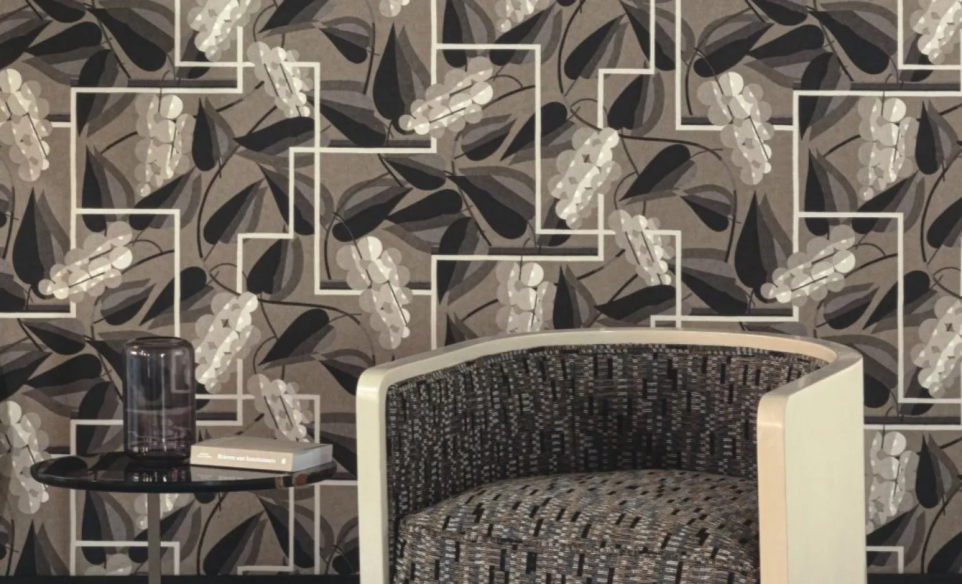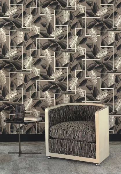 Henry Stéphany, der dieses Muster entwarf, war bekannt für seine stilisierten Blüten und gebrochenen Muster. HENRY ist eine diagonale Komposition von Trauben entlang eines rechteckigen Gitters, wo sie scheinen, sich zu bewegen oder sogar zu wachsen. Es ist eine Wandverkleidung, die eine Fülle und einen Reichtum symbolisiert.