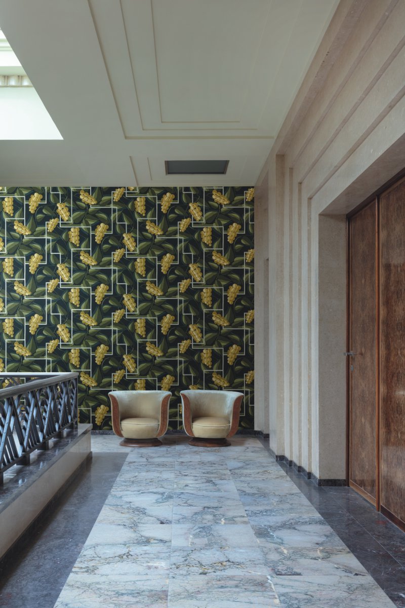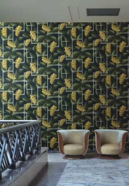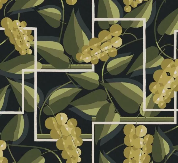 Henry Stéphany, der dieses Muster entwarf, war bekannt für seine stilisierten Blüten und gebrochenen Muster. HENRY ist eine diagonale Komposition von Trauben entlang eines rechteckigen Gitters, wo sie scheinen, sich zu bewegen oder sogar zu wachsen. Es ist eine Wandverkleidung, die eine Fülle und einen Reichtum symbolisiert.