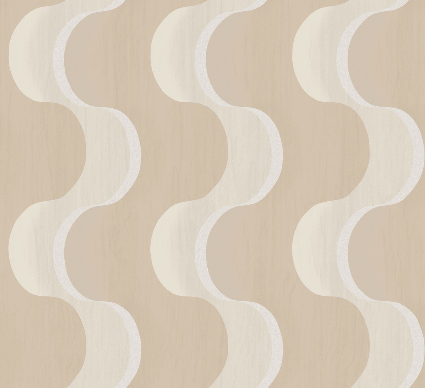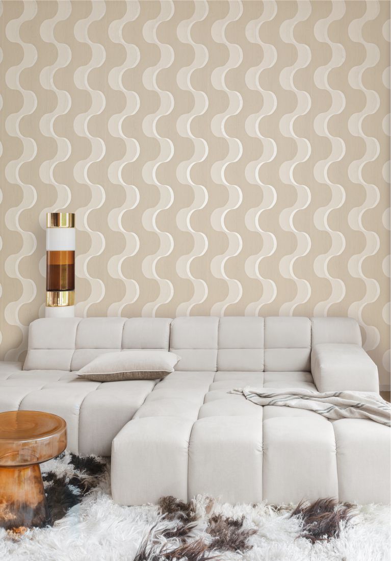 Dieses geschwungene Design, inspiriert von der traditionellen Kunst der Holzvertäfelung, bringt Geschichte an die Wand – jedoch in der Form einer kraftvollen Welle. Der matte, holzähnliche Hintergrund von "Flow" steht im spannenden Kontrast zu den glänzenden Akzenten in Kupfer, Messing oder Metalloptik. Diese metallischen Highlights verleihen der Tapete eine zusätzliche Dimension von Luxus und Eleganz.