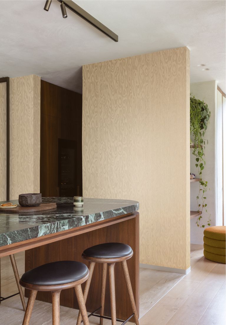 Im Design Oakly treten die Maserungen eines Baumes je nach Lichteinfall mal mehr, mal weniger hervor. Feine, detaillierte Holzschichten, die an kunstvolle Intarsien erinnern, verleihen dieser Ton-in-Ton-Tapete zusätzliche Tiefe und bringen Eleganz sowie eine Fülle an Details zum Ausdruck.