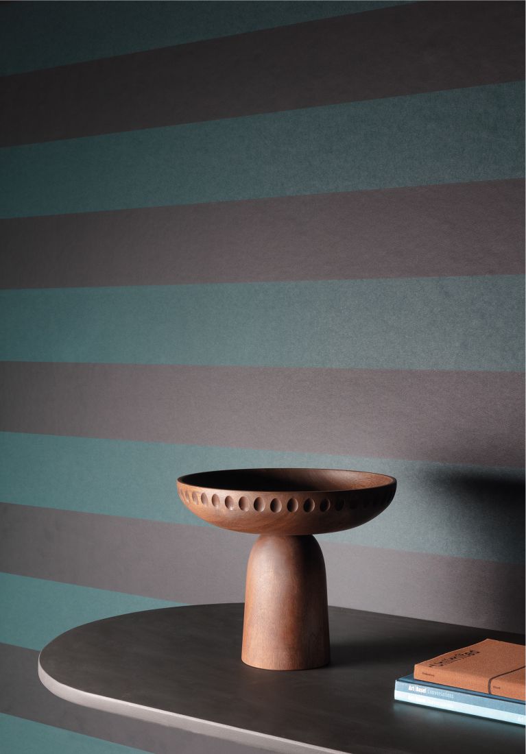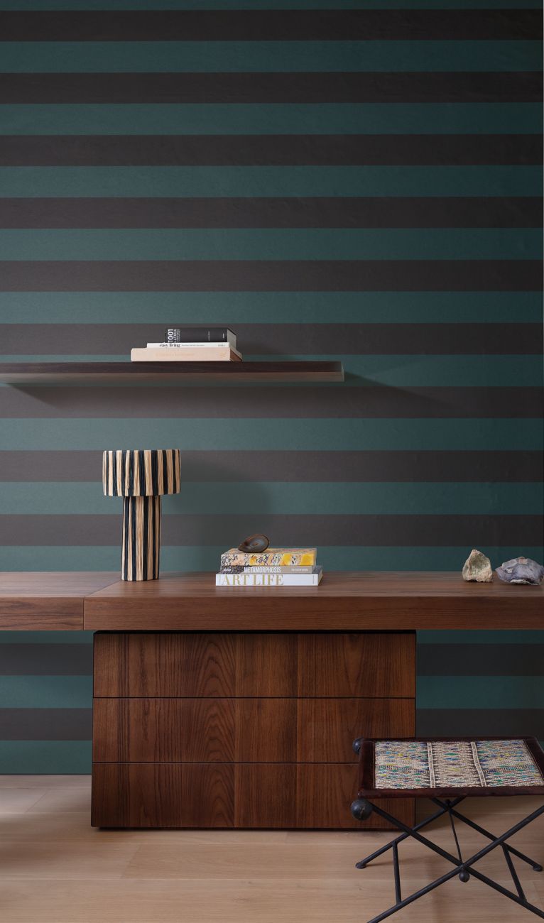 Brody ist eine klassische Streifentapete, doch ihre sehr matte Oberfläche verleiht ihr einen ausgesprochen modernen Charakter. Die klaren, geraden Linien sorgen für eine strenge, aber zugleich elegante Wirkung. Sie ist entweder in dezenten Ton-in-Ton-Farben oder in markanteren, tieferen Farbtönen erhältlich.