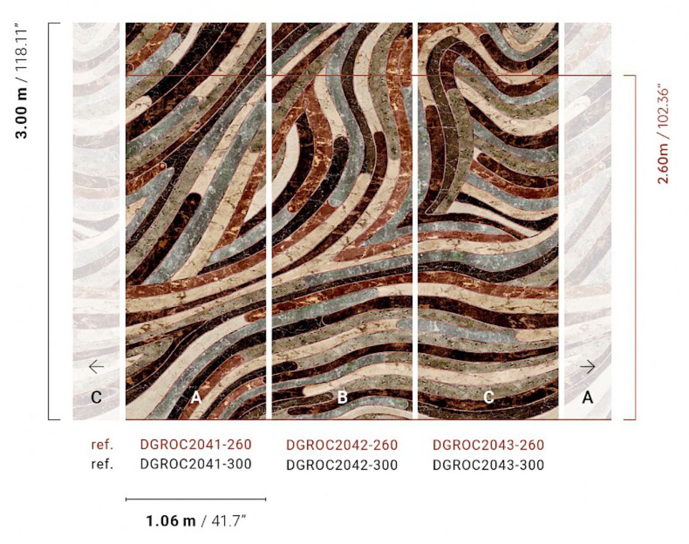 Die Panoramatapete Serpentine erinnert an ein fantastisches monumentales Werk aus eingelegtem Marmor. Die kurvige, wellenförmige Bewegung lässt die Steineffekte weniger kühl erscheinen und verleiht dem Ganzen eine sinnliche, warme Ausstrahlung.