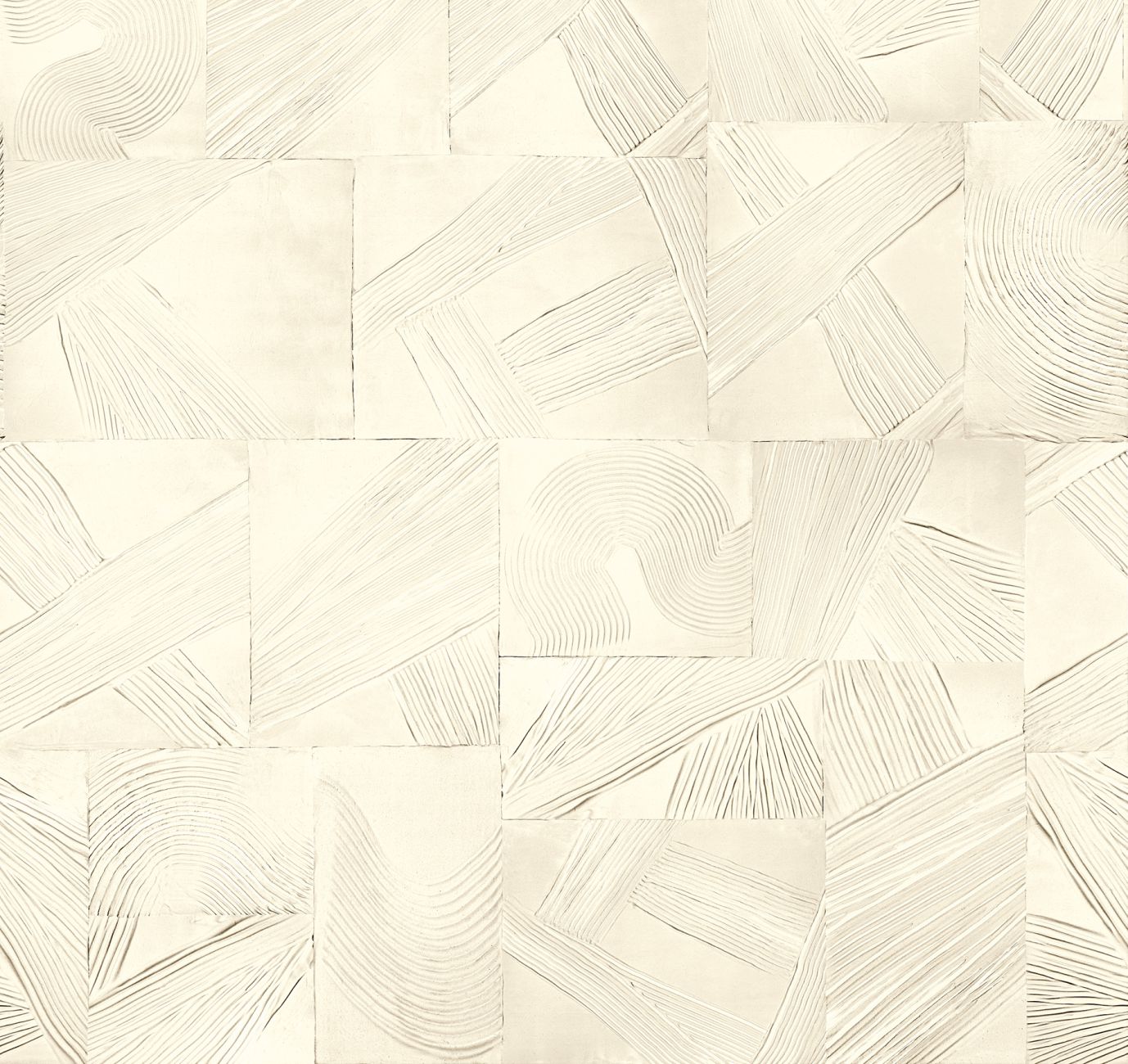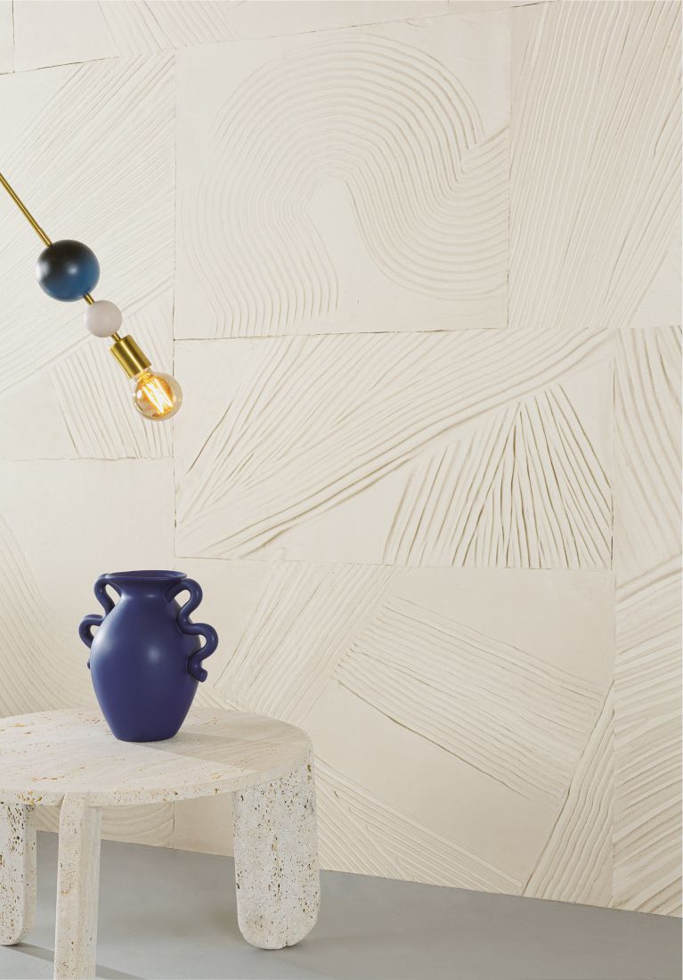 Die Panoramatapete Paros wurde ebenfalls von der Flachrelieftechnik inspiriert. Der skulpturierte Lehmgips wurde in große Blöcke aufgeteilt, um eine monumentale und architektonische Wirkung zu erzielen. Die Schatten und der Effekt der Leinenstruktur, auf der dieses Design gedruckt ist, verleihen ihm zusätzliche Tiefe.