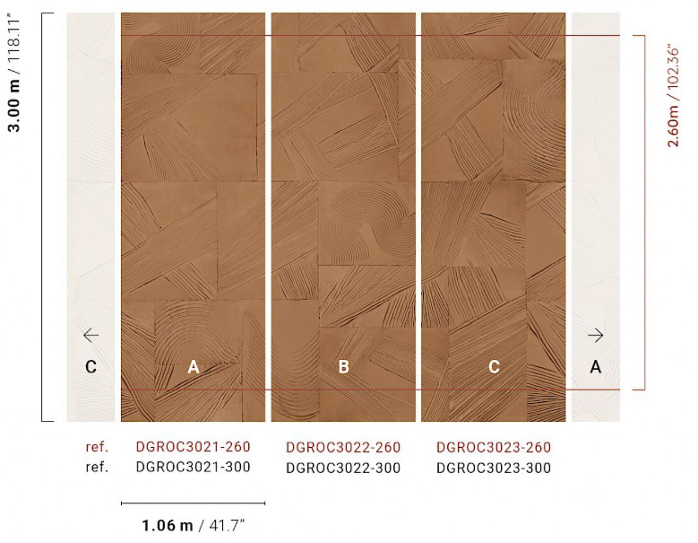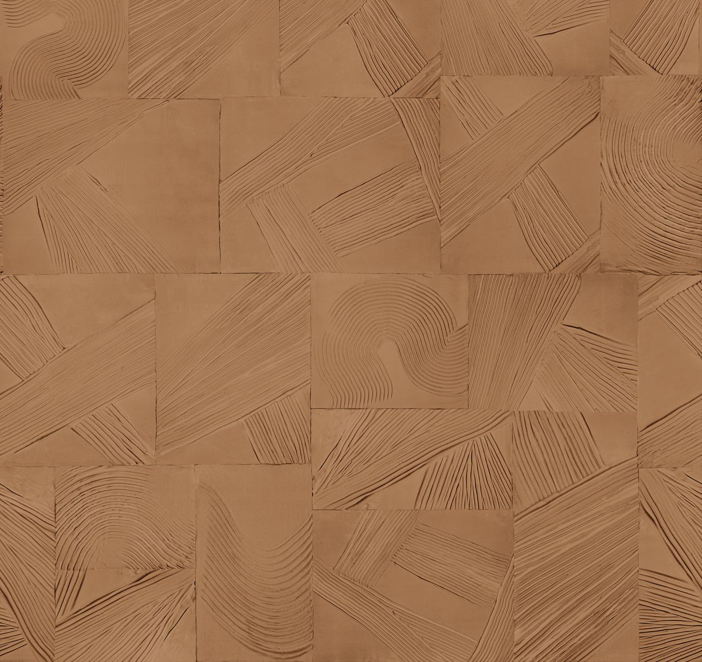 Die Panoramatapete Paros wurde ebenfalls von der Flachrelieftechnik inspiriert. Der skulpturierte Lehmgips wurde in große Blöcke aufgeteilt, um eine monumentale und architektonische Wirkung zu erzielen. Die Schatten und der Effekt der Leinenstruktur, auf der dieses Design gedruckt ist, verleihen ihm zusätzliche Tiefe.