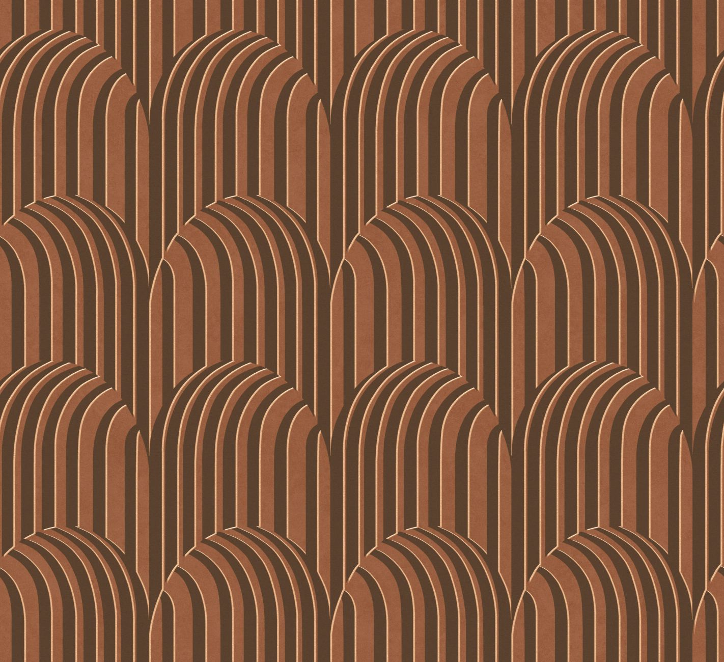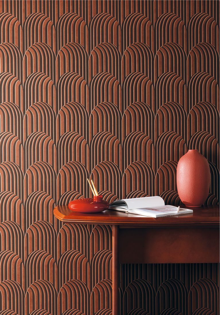 Bei diesem Design gehen wir von einem herrlichen Travertin-Tisch aus und verwandeln dieses 3D-Objekt in eine 2D-Zeichnung. Die optische Täuschung wird durch eine feine Schattenlinie in glänzender Kontrastfarbe verstärkt. Das einfallende Licht erhellt die Wölbungen, sodass die Tapete sehr architektonisch wirkt.