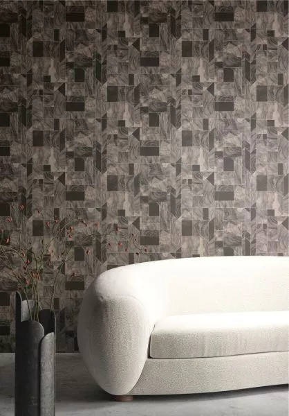 Theila bezaubert durch eine Kombination aus Marmor mit wunderschöner, detaillierter Maserung. Zwischen den Steinelementen verläuft eine feine Linie, die eine Art Buntglaseffekt erzeugt.
