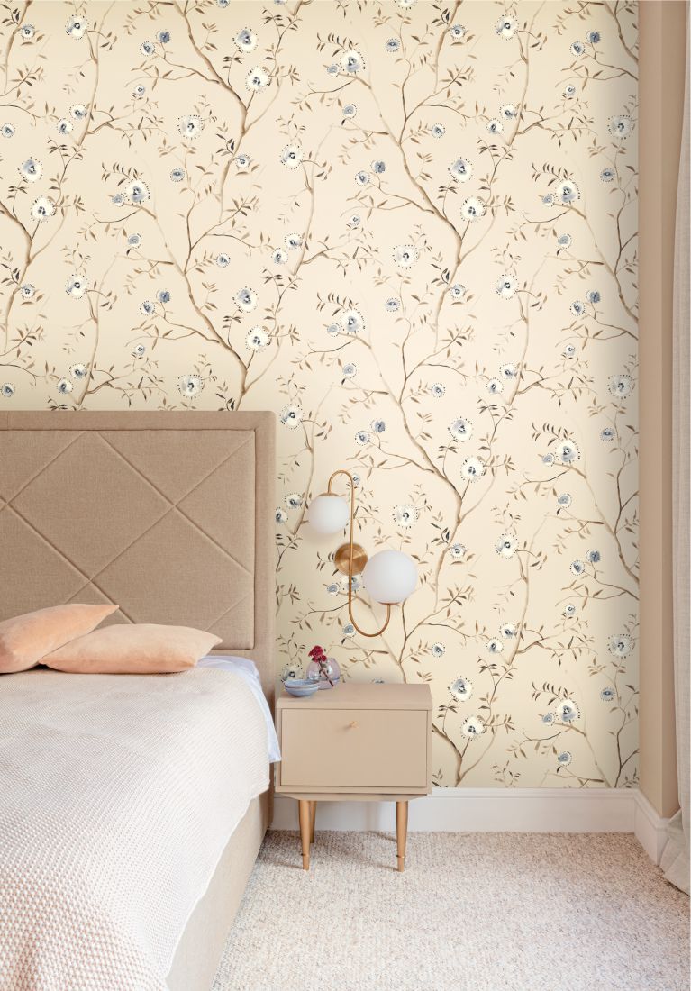 Unsere Tapete Sari mit ihren schönen Blüten verweist auf diese zahlreichen Textildesigns. Ein Sari besteht aus einem traditionellen, fünf bis sieben Meter langen Stück Stoff und ist in Indien das bekannteste Kleidungsstück für Frauen. Die handgemalten Blüten auf unserer Wandverkleidung werden durch einen Glanzeffekt auf den Blumen und einen Unscharf-Effekt an den Blättern und Zweigen abgerundet.