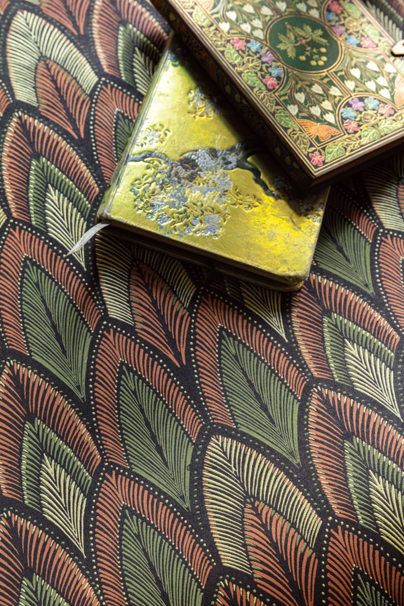 Im Design Dabu wurde der geometrische Blockprint mit einem Naturmotiv kombiniert. Die rhythmische Darstellung eines abstrahierten Blattes erhält durch spezielle Drucktechniken einen schönen Relief-Effekt. Das Wort „dabu“ kommt vom Hindi-Begriff „dabana“, was „pressen“ bedeutet. Dies geht auf den Gebrauch handgeschnitzter Stempel zurück, mit denen Muster auf Stoffe gedruckt werden.