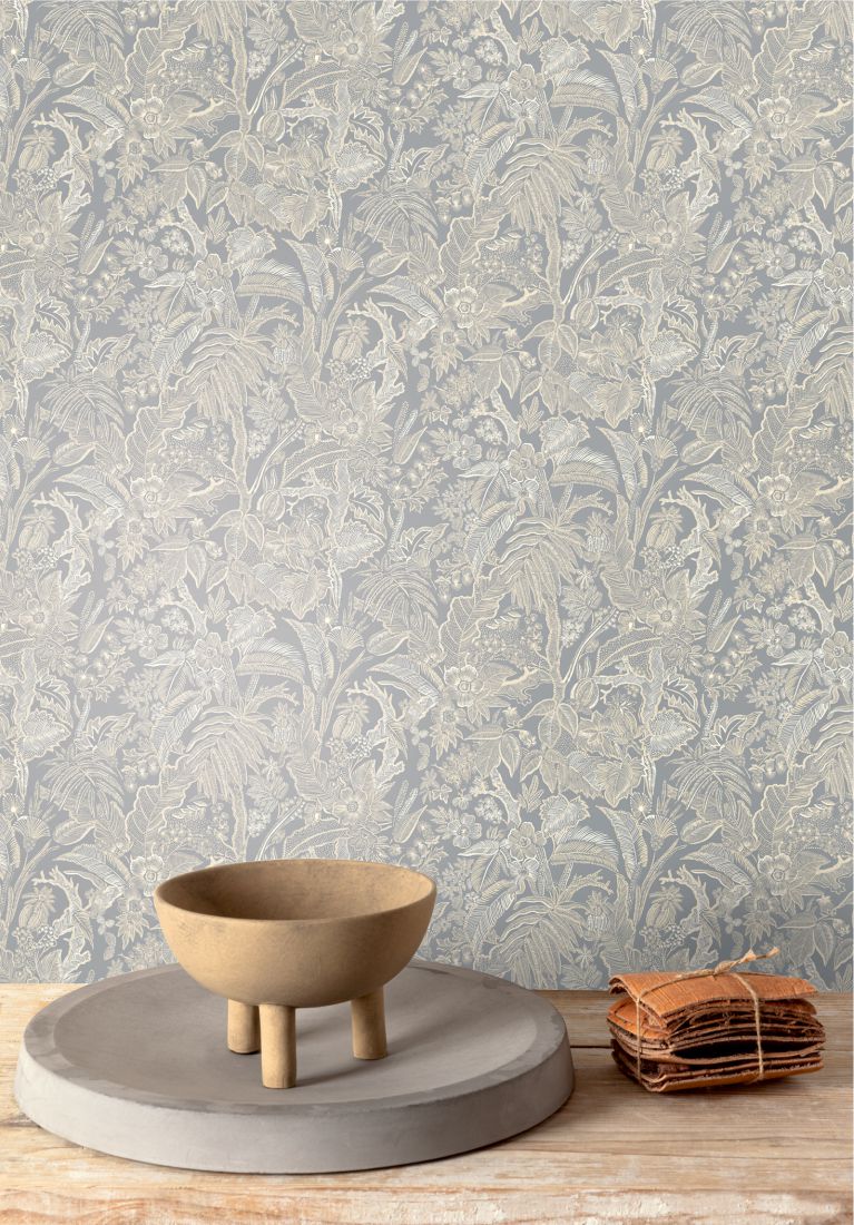 Onikar ist ein herrliches All-over-Design mit einer Strichzeichnung von Blättern und Blumen. Das Modell ist in Blau oder Grün auf schwarzem Hintergrund erhältlich. Sie können aber auch ein weißes Muster auf einem senffarbenen, silberfarbenen, beigen oder graublauen Hintergrund wählen.