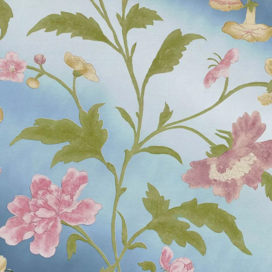 China Rose (um 1885) ist ein klassisches extravagantes Blumenmuster aus einem französischen handbemalten „Peking Stripe“ -Stoff aus dem späten 19. Jahrhundert mit einem deutlichen chinesischen Einfluss. Die verzweifelten undurchsichtigen Farben in den Blättern und Blütenblättern zeigen die Hand des ursprünglichen Künstlers, im Gegensatz zu einer vernünftigen modernen Verwendung von Glimmer und Metallic-Tinten, wie sie in einigen Farben zu sehen ist.