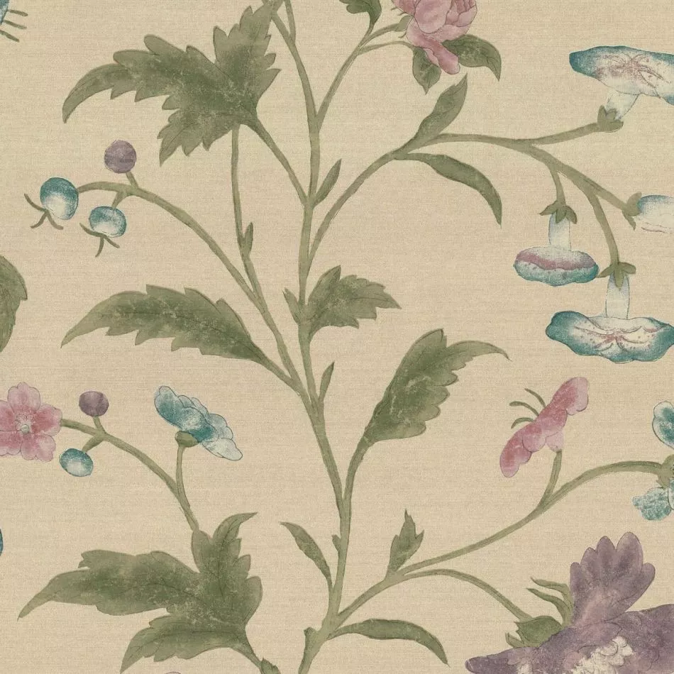 China Rose (um 1885) ist ein klassisches extravagantes Blumenmuster aus einem französischen handbemalten „Peking Stripe“ -Stoff aus dem späten 19. Jahrhundert mit einem deutlichen chinesischen Einfluss. Die verzweifelten undurchsichtigen Farben in den Blättern und Blütenblättern zeigen die Hand des ursprünglichen Künstlers, im Gegensatz zu einer vernünftigen modernen Verwendung von Glimmer und Metallic-Tinten, wie sie in einigen Farben zu sehen ist.
