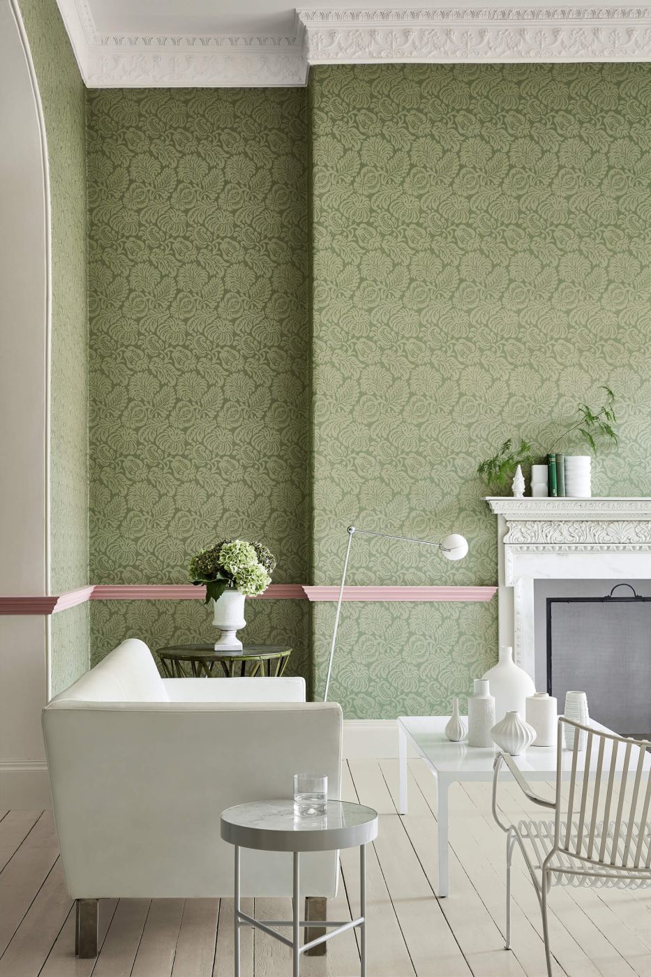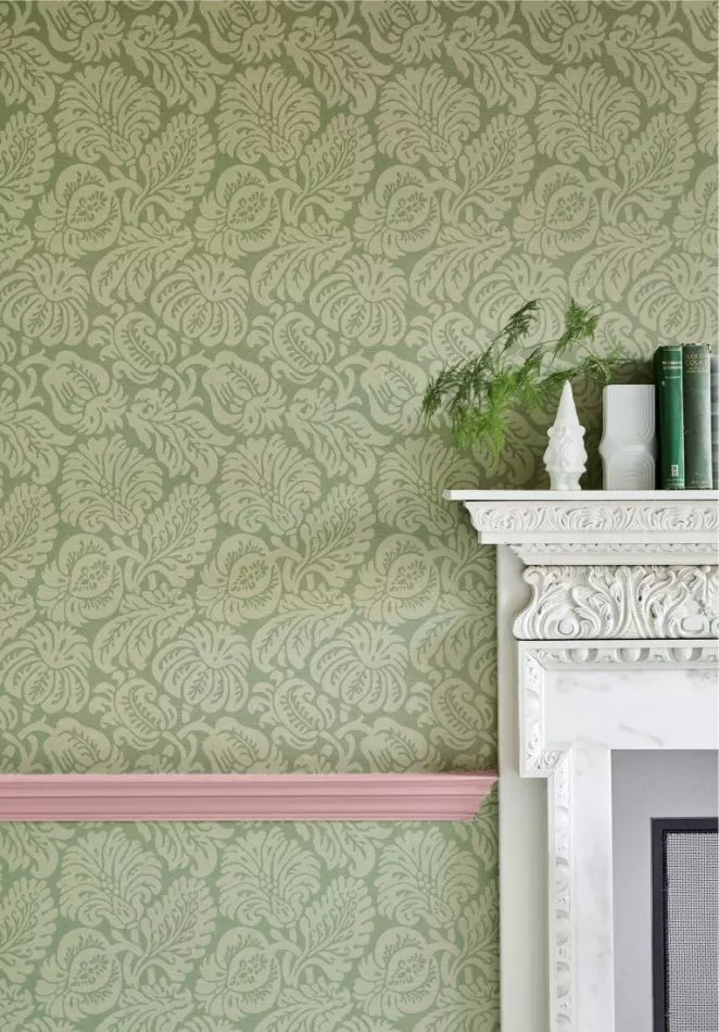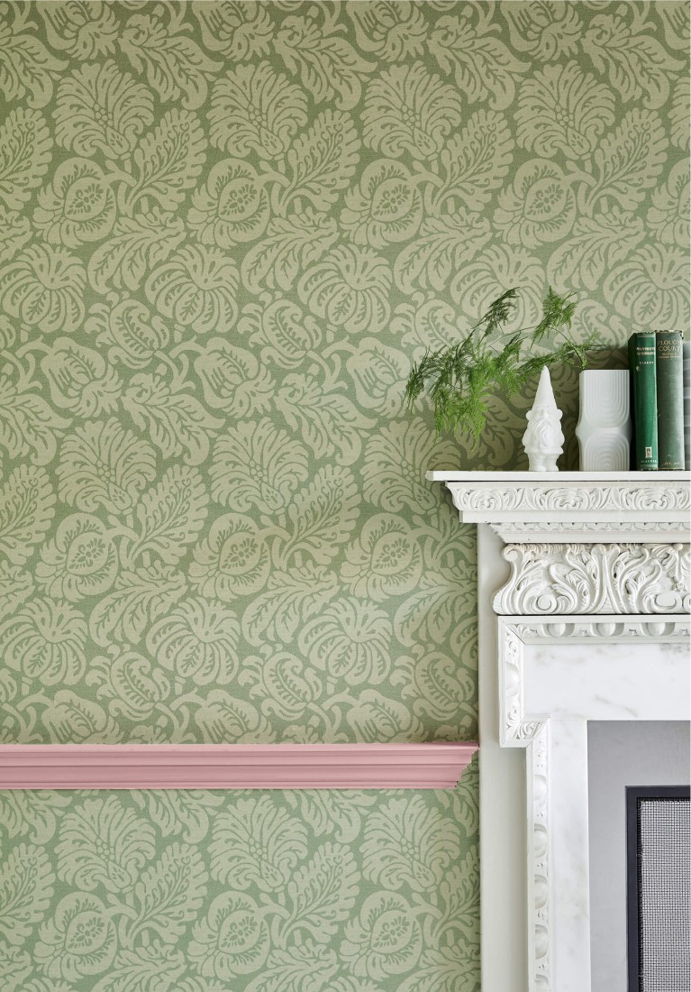 Die Quelle dieses Designs war ein typischer historischer Damast, ein gewebter Seidenstoff aus dem 19. Jahrhundert, dessen Wirkung mit dem Druck repliziert wurde. Wie bei dem Design High Street aus London Wallpapers III findet man dieses Muster an mehr als einem Standort, woraus sich schließen lässt, dass es bereits ab dem 18. Jahrhundert bis Ende des 19. Jahrhunderts in beträchtlichen Mengen hergestellt worden sein muss. Dies entspricht auch den industriellen Produktionsmöglichkeiten zu dieser Zeit.