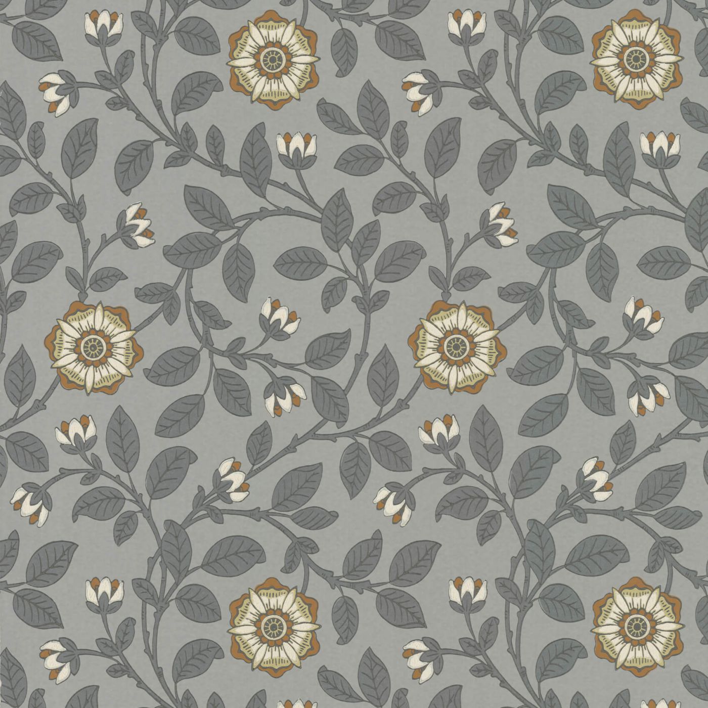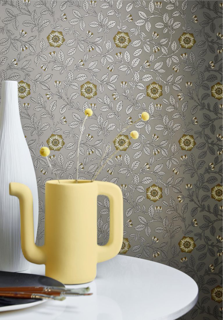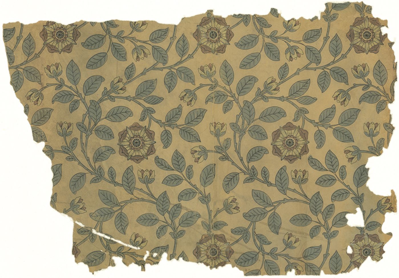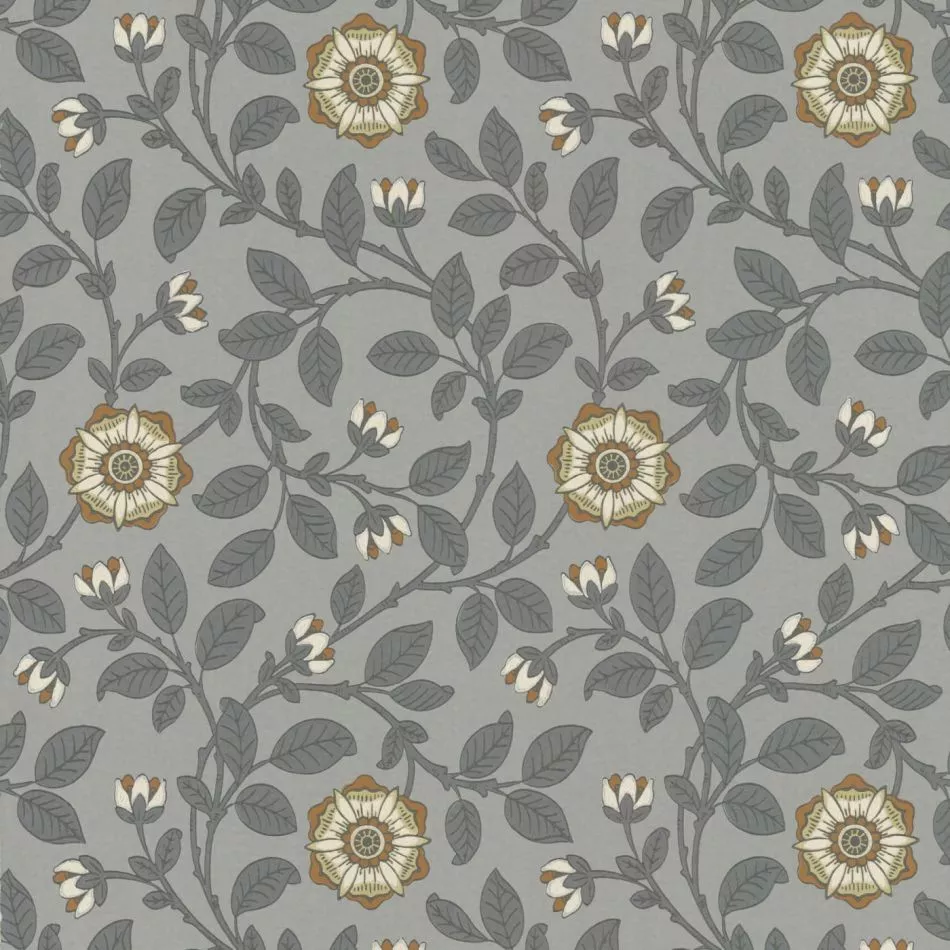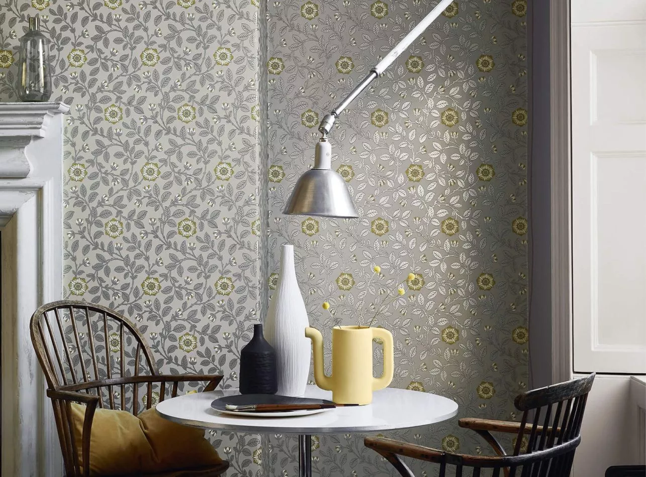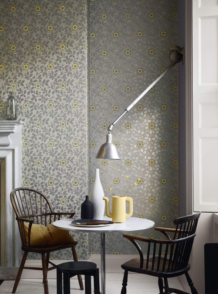 Das noch erhaltene Beispiel dieser Tapete aus dem 19. Jahrhundert wurde nicht an den Wänden eines schicken Reihenhauses in Richmond gefunden, sondern während einer Renovierung 1989 in einem Container davor, was gar nicht der Qualität dieser Tapete entspricht. Die Ausführung dieser zarten Tudor-Rose ist typisch für viele Designs, die Ende des 19. Jahrhunderts im Stil von William Morris angefertigt wurden. Little Greene hat es in zwei authentischen Farbkombinationen der Arts-and-Crafts-Bewegung gedruckt, drei klassischen Farbkombinationen und einer modernen mit Metallictönen.