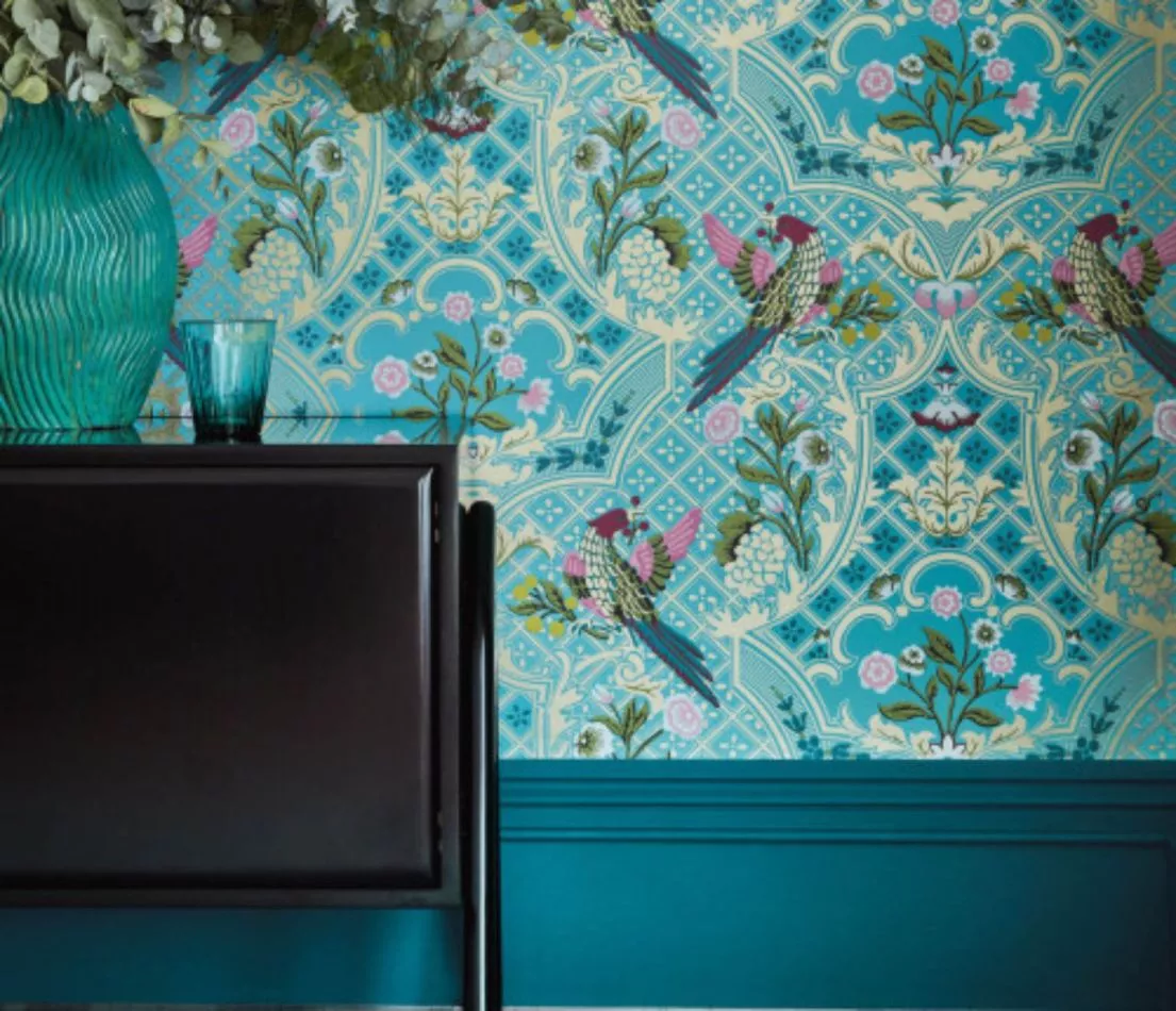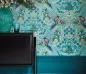 Ein lebhaftes, fesselndes Design mit auffälligen Vögeln und zarten Blumenmotiven. Das leicht erhöhte Muster mit reich vergoldeten Details sollte vom Aussehen her ursprünglich gestempeltes Leder imitieren. Die auf französischen Stoffen und Dekors aus dem frühen 18. Jahrhundert basierende Tapete mit Feldern, Schnörkeln und Schraffuren wurde in Brodsworth Hall in Süd-Yorkshire gefunden. Dieses elegante viktorianische Herrenhaus wurde zwischen 1861 und 1863 erbaut. Es war bis 1990 in Privatbesitz und diente als Wohnhaus. Danach wurde es von English Heritage übernommen und restauriert. Die Tapete war bei der Familie eindeutig beliebt; sie wurde, was ungewöhnlich war, in jeweils umgekehrter Farbkombination sowohl in der Bibliothek als auch im Frühstückszimmer verwendet und ist dort noch heute zu besichtigen.