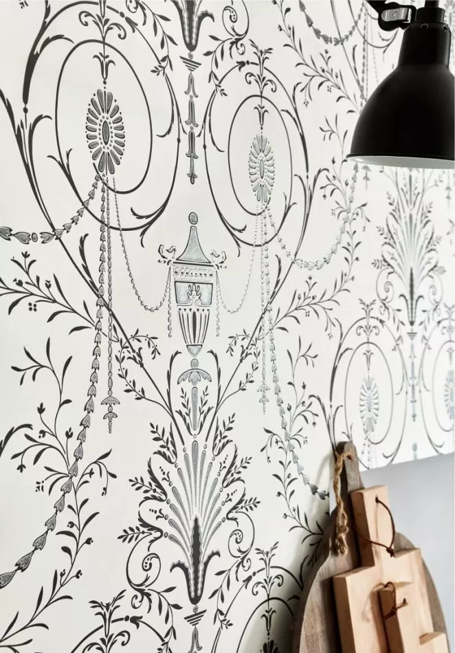 Ein groß angelegtes Design, das an eine Interpretation eines Robert Adams Designs aus dem frühen 20. Jhd. erinnert. Diese Tapete wurde kurz nach dem Tod von Queen Mary, die bis 1953 im Marlborough House lebte, entdeckt. Anschließend wurde das Haus zum Generalsekretariat des Commonwealth.