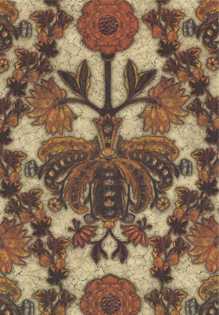 Dieses Fragment eines geprägten Lederwandbehangs datiert aus der Zeit, als Tapeten noch unbekannt waren, und ist eines der ältesten überlieferten Dokumente, die das Tapetenarchiv von English Heritage beherbergt. Bahnen aus geprägtem und bemaltem Leder, meist mit Blumenmotiven verziert, waren beliebte, wenn auch kostspielige Wanddekorationen im ausgehenden 16. und 17. Jahrhundert. Die Bahnen wurden zu großflächigen dekorativen Wandbehängen zusammengenäht, so wie man Tapetenbahnen nebeneinander hängt, um eine eindrucksvollere Wirkung zu erzielen.