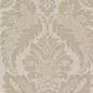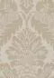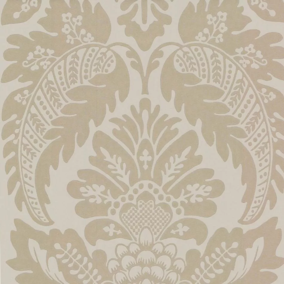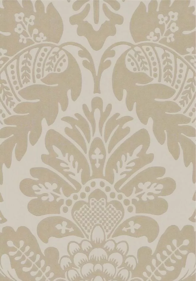 Ein klassisches Damastdessin mit den für die Mitte des 18. Jahrhunderts sehr typischen und beliebten großflächigen Granatapfel-Motiven. Diese Tapete war ursprünglich wahrscheinlich eine Vliestapete und schmückte ein englisches Herrenhaus. Vliestapeten waren eine englische Spezialität und, obwohl sie eigentlich nur Imitationen kostspieliger Textilien waren, teuer in der Herstellung und somit plakativer Ausdruck von Luxus und gesellschaftlicher Stellung.