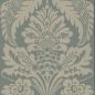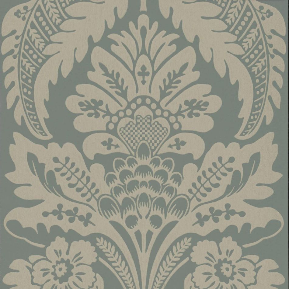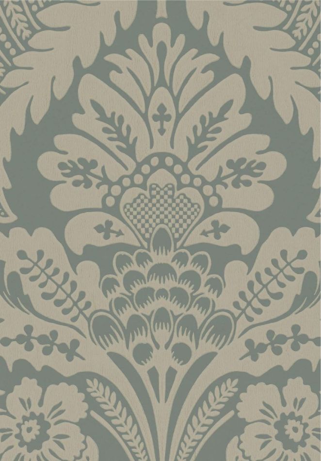 Ein klassisches Damastdessin mit den für die Mitte des 18. Jahrhunderts sehr typischen und beliebten großflächigen Granatapfel-Motiven. Diese Tapete war ursprünglich wahrscheinlich eine Vliestapete und schmückte ein englisches Herrenhaus. Vliestapeten waren eine englische Spezialität und, obwohl sie eigentlich nur Imitationen kostspieliger Textilien waren, teuer in der Herstellung und somit plakativer Ausdruck von Luxus und gesellschaftlicher Stellung.