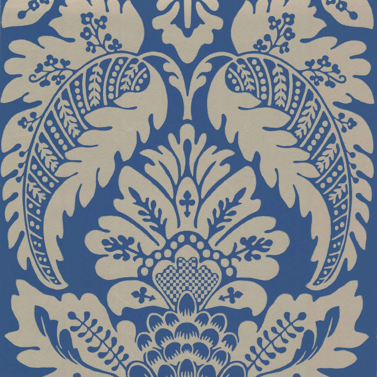 Ein klassisches Damastdessin mit den für die Mitte des 18. Jahrhunderts sehr typischen und beliebten großflächigen Granatapfel-Motiven. Diese Tapete war ursprünglich wahrscheinlich eine Vliestapete und schmückte ein englisches Herrenhaus. Vliestapeten waren eine englische Spezialität und, obwohl sie eigentlich nur Imitationen kostspieliger Textilien waren, teuer in der Herstellung und somit plakativer Ausdruck von Luxus und gesellschaftlicher Stellung.