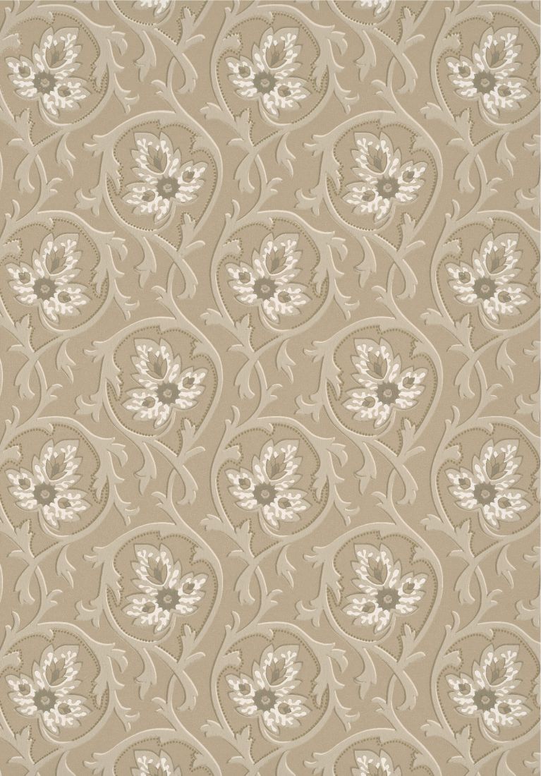Dieses klassische Muster mit Blätterranken wurde für ein traditionelles wie handgemaltes Finish auf die Oberfläche gedruckt und zur Dekoration eines Dachbodens der Oxburgh Hall verwendet. Obwohl das Designelement von spanisch geprägtem und vergoldetem Leder aus dem 17. Jahrhundert zeugt, stammt es aufgrund des Drucksubstrats, das aus maschinengedrucktem Papier besteht, wahrscheinlich aus dem späten 19. Jahrhundert.