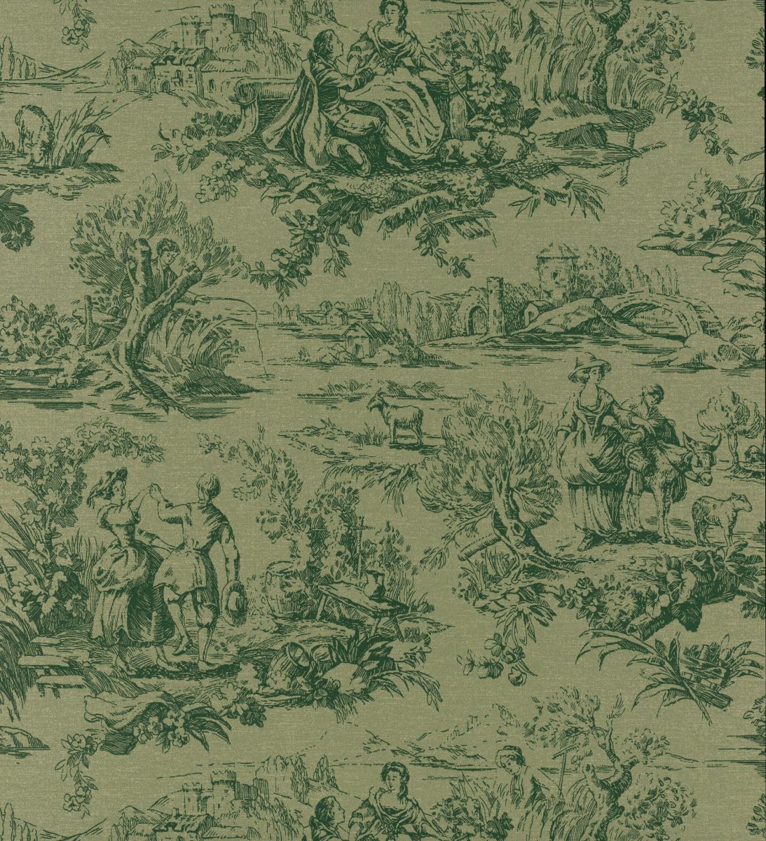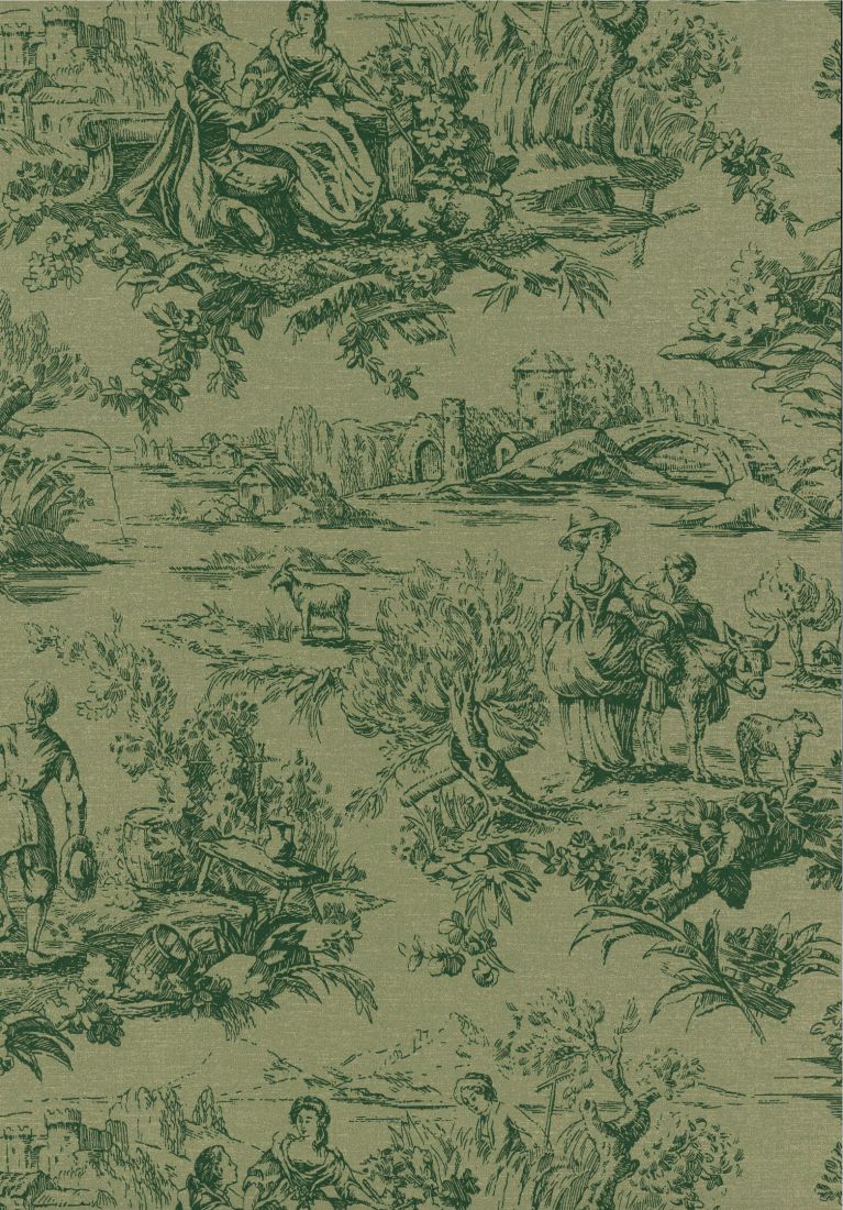 Diese zeitgenössische Umsetzung eines klassischen Musters ist eine Neuinterpretation eines französischen „Toile-de-Jouy“-Designs aus der Zeit nach dem Zweiten Weltkrieg. Dieses einfarbige Design zeigt Vignetten von Menschen, die unterschiedlichen Aktivitäten wie Angeln, Tanzen und Gartenarbeit nachgehen, und wurde in fünf modernen Farbstellungen gedruckt. Passend zum Colour Drenching bieten zwei der Farbstellungen die gleiche Farbe in unterschiedlichen Nuancen.