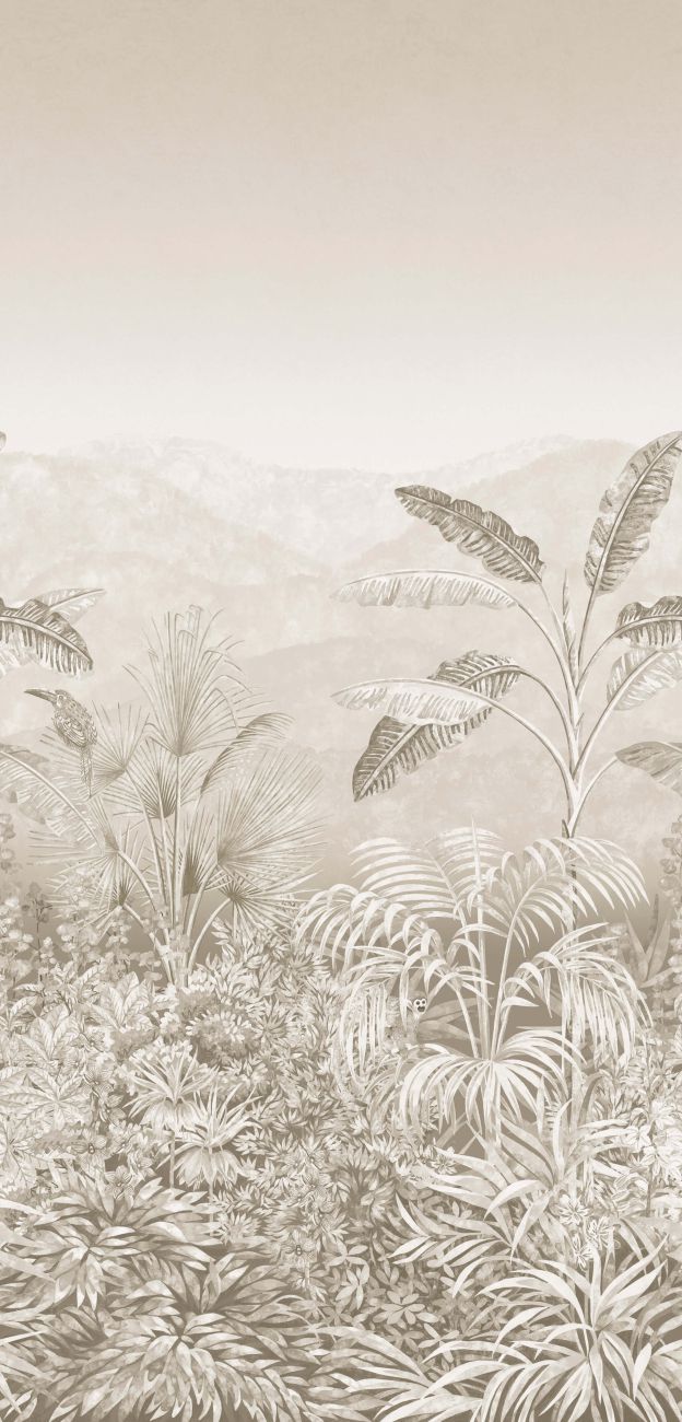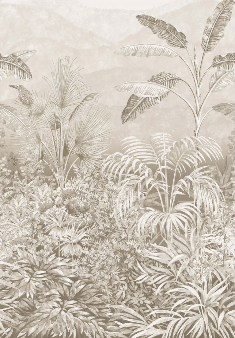 Dieses Wandgemälde ist von historischen Wandpaneelen aus dem frühen 19. Jahrhundert von Velay und Zuber inspiriert und wurde von Hand neu gemalt, um die idealisierte und stereotypische Darstellung von Landschaften wiederzugeben, die damals als romantisch oder exotisch galten. Verteilt über drei Bahnen zeigt diese zeitgenössische Interpretation ein üppiges Panorama mit Affen und tropischen Vögeln. In vier Farbvariationen erhältlich bringt diese Tapete Dynamik und einen spannenden Blickfang in jeden Innenraum.