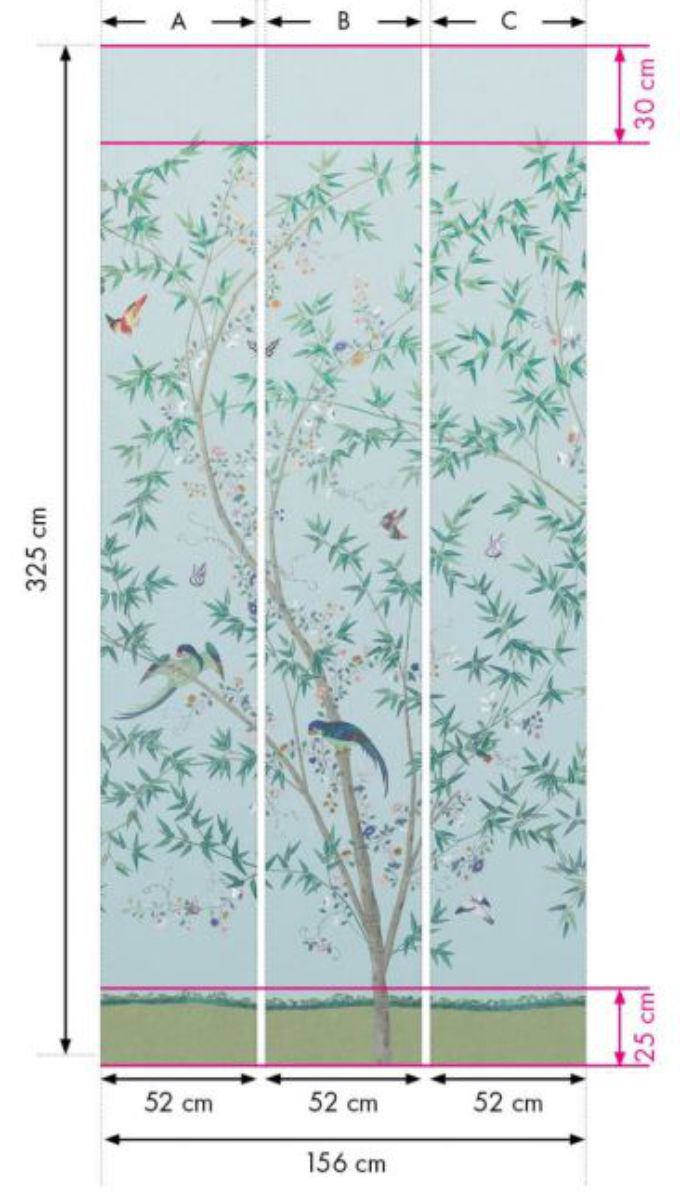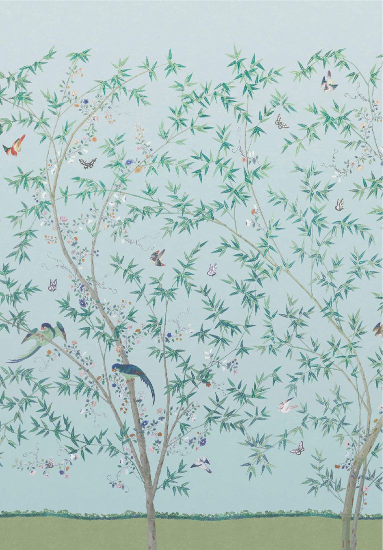 Das vielbewunderte Original dieser Tapete befindet sich im chinesischer Schlafzimmer des Belton House in Lincolnshire. Während die Tapete selbst deutlich älter ist, weiß man, dass die Szene einer Gartenparty mit einer Kombination aus gedruckten und handgemalten Elementen aus dem Jahr 1785 datiert und erst mehr als 50 Jahre später im Jahr 1840 angebracht wurde. Das Original umfasst Personen, exotische Vögel, eine besondere Perspektive und außergewöhnliche Details. Die moderne Interpretation wurde vereinfacht, um dem sich ausbreitenden Bambus sowie der charmanten Interaktion zwischen Vögeln, Schmetterlingen und Blüten mehr Raum zu geben. Das im Digitaldruck hergestellte und in drei Farbstellungen erhältliche horizontale Muster wiederholt sich über zwei Standardrollen, also über knapp mehr als drei Meter in der Breite.