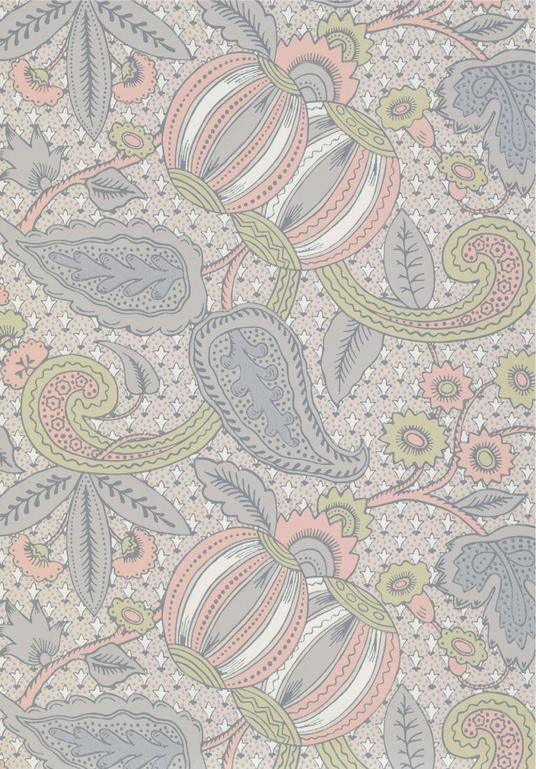 Dieses barocke Design ist ein seltener und sehr früher Fund, der vom National Trust unter Wandteppichen in der Erddig Hall in Wales entdeckt wurde. Es wurde in Blöcken auf handgefertigte Papierbahnen gedruckt, die direkt an die Wand genagelt wurden (anstatt sie zu kleben); als sie entfernt wurden, fand man auf der Rückseite den ältesten verifizierten Steuer-Stempel. Das farbenfrohe gelbe Original wurde in vier Farbgebungen verschlankt. Drei weitere Farbstellungen sorgen dafür, dass dieses fröhliche Paisleydesign auch im modernen Interior vielseitig verwendet werden kann.