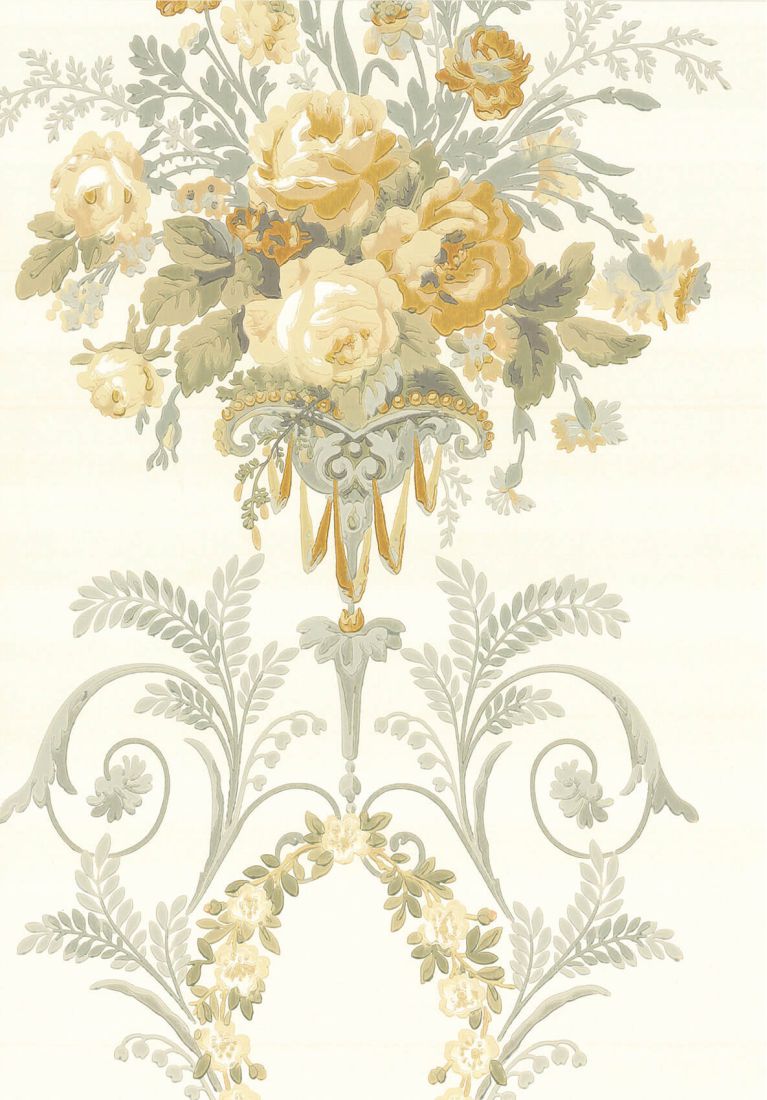 Eine klassische Interpretation dieses Musters, das so typisch ist für französische Tapetenpaneele, die der Hersteller Réveillon ab Ende des 18. Jahrhunderts produzierte. Das Design wurde im Blockdruck in achtzehn Farben auf 47 cm schmalem Papier gedruckt und wiederholt sich vertikal alle 67 cm. Die Größe, der Stil und die Oberflächenbehandlung des Originaldesigns wurden beibehalten und zeigen Blumenbouquets und -gebinde mit dekorativen Drapierungen und Arabesken.