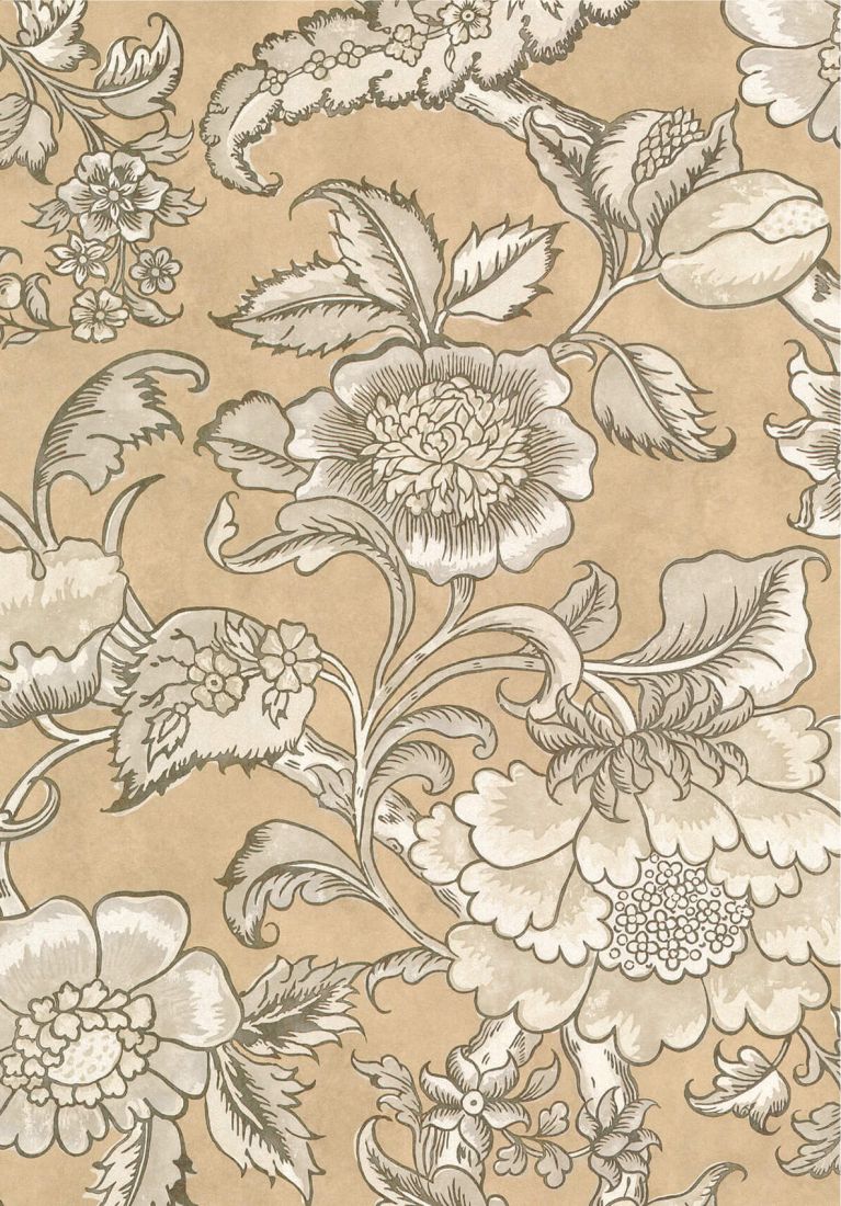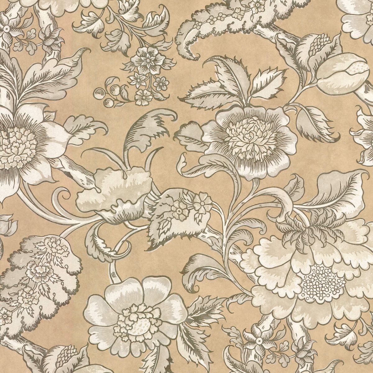 Eines der größten und am besten erhaltenen Muster im Archiv. Dieses Design wiederholt sich alle 99 cm und hat eine ungewöhnliche Breite von 80 cm, daher ist jede Bahn wesentlich breiter als eine Standard-Tapetenrolle von 52 cm. Das noch existierende Beispiel wurde im hinteren Schlafzimmer eines Hauses gefunden, das man für den niederen Adel gebaut hatte. Es war ursprünglich auf Tafeln tapeziert und wies zusätzliche Blumen auf, die man nachträglich von Hand hinzugefügt hatte, um die Tapetenränder zu verdecken.