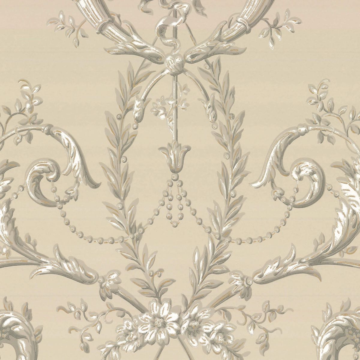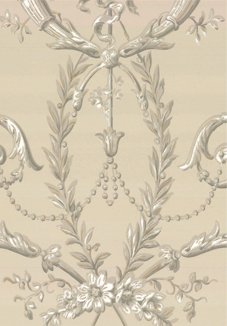 Versailles c.1890 ist eine Tapete, die etwas später entstanden ist, als ihr traditionelles Design vermuten lässt. Sie basiert auf einem Originaldokument, das mit Farbabstufungen maschinell bedruckt wurde, um ihr einen Trompe-l’œil-Effekt zu verleihen. Ganz im klassischen Rokokostil weist sie Schnörkel und eine Fülle von Blumen auf.