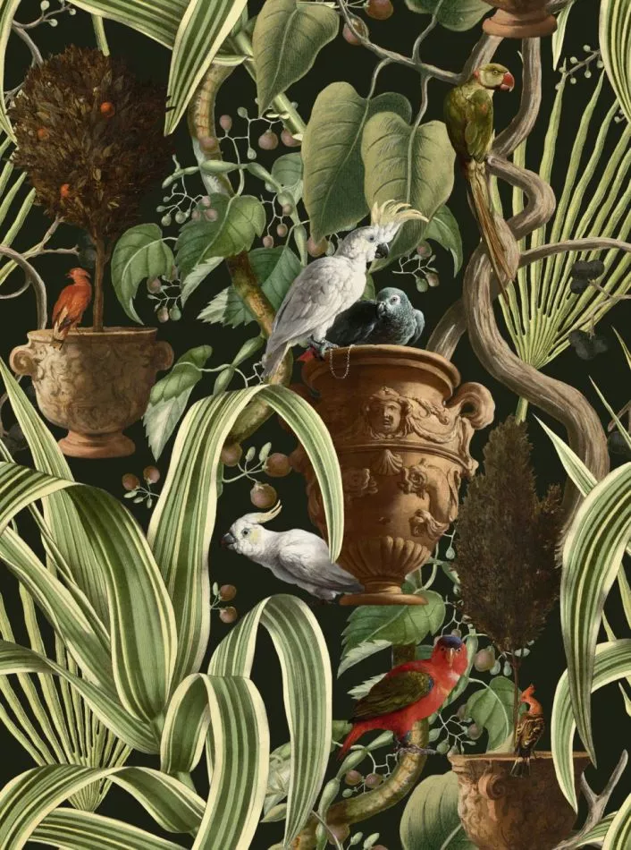 Ein reiches tropisches Design, inspiriert von den Gärten des Adels aus der Kolonialzeit in der Karibik. EXOTIC MENAGERIE ist eine exotische Statement-Tapete mit wunderschön illustrierten Papageien und bestimmten Pflanzen. Erhältlich in zwei Farbversionen: hell und dunkel.