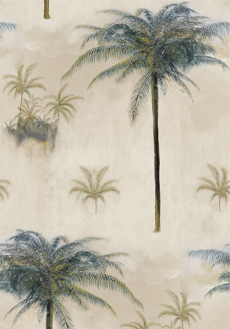 CAYO LARGO hat seinen Namen von der berühmten Ferieninsel in den Karibik und ist ein helles Farbschema mit großformatig bemalten Palmen auf einem gewaschenen Hintergrund, der an die wunderschönen kubanischen Sonnenuntergänge erinnert. Eine Tapete im exotischen Stil mit sanften Tönen und tropischen Elementen, die eine sehr kubanische Atmosphäre schafft.