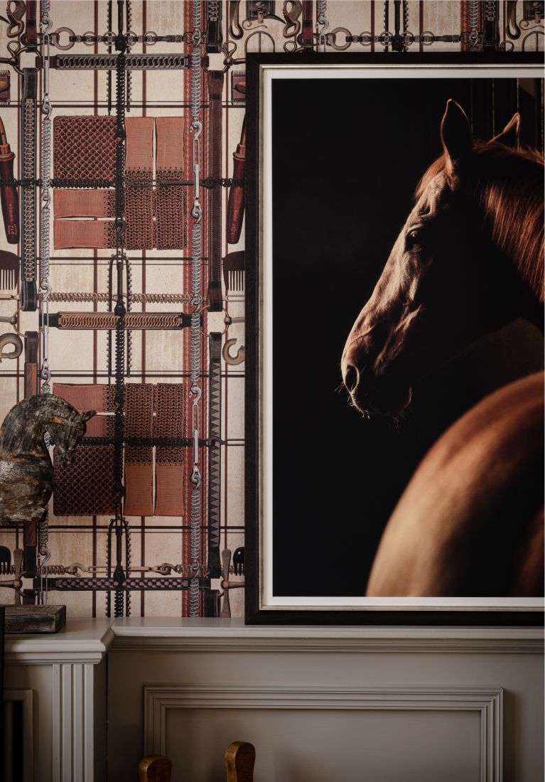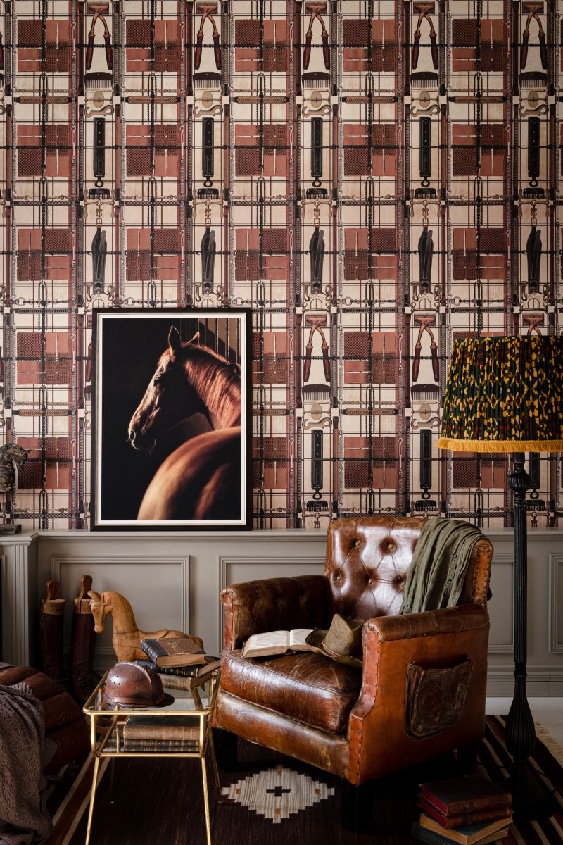 Als pferdeartige Interpretation eines klassischen Tartan-ähnlichen Drucks präsentiert HARNESSMAKER’s ATELIER Stallzubehör und Werkzeuge auf den kunstvollsten Displays. Vergessen Sie das Praktische, bei diesem Muster geht es darum, die Schönheit des Alltags anzunehmen und Freude an einfachen Dingen zu finden. Kämme, Haken, Riemen und Werkzeuge in jeder Form und Größe fügen sich zu einem abstrakten Karomuster zusammen, jedes Stück sorgfältig gezeichnet in einem illustrativen, lebensnahen Stil, der im Atelier eines Geschirrmachers zu finden ist. Lederige Farbblöcke kontrastieren mit antiken weißen Flecken und sind mit subtilen Metallic-Tönen verziert – entscheiden Sie sich für einen dunkelmarineblauen Hintergrund für ein gemütliches, intimes Gefühl oder den helleren cremefarbenen Hintergrund, der jeden einzelnen Artikel akzentuiert.