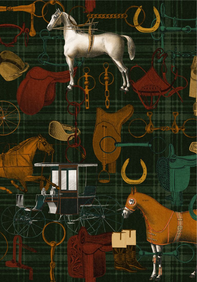 Als detaillierte Bestandsaufnahme dessen, was jeder Reiter für einen zufriedenstellenden Tagesritt braucht, ist THE JOCKEY eine visuelle Liste, wie Sie Ihren Stall ausstatten können. Glänzende Hufeisen, Ledersättel, Zaumzeug, Stiefel und Kutschen lehren die Kunst des Reitens und Putzens. Mit jedem Gegenstand, der sorgfältig in schattierten Zeichnungen im Stil des 19. Jahrhunderts dargestellt ist, ist das Muster in satten, königlichen Tönen gefärbt, die von Dunkelrot bis Smaragdgrün und Erdbraun reichen, mit einer Rückseite aus dunklem Karo, das dem Design einen Hauch von verleiht Herrenclub, Salon oder Bibliothek.
