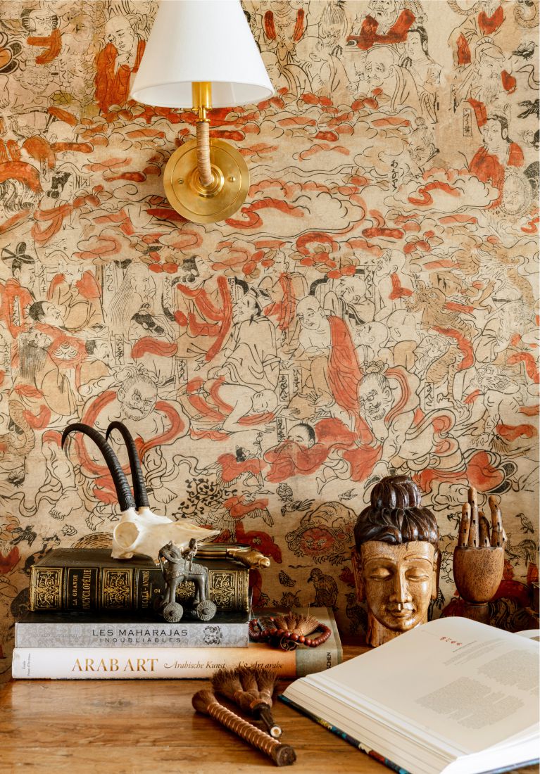 Treten Sie etwas näher heran – von weitem mag unsere Tapete SPIRITUAL JOURNEY wie ein abstraktes Schnörkelmuster erscheinen, aber bei näherer Betrachtung entdecken Sie eine Vielzahl von handgezeichneten Charakteren, die auf einem hellbeigen Hintergrund inmitten von Farbklecksen leben. Schwebend wie Rauch oder Nebel navigiert ein rostiger Orangeton um Menschen, Pflanzen, Tiere, Wolken und Kalligraphien, die alle als einfache Strichzeichnungen im altchinesischen Stil illustriert sind. Nehmen Sie sich Zeit, um jeden Zentimeter zu durchstreifen und tauchen Sie ein in eine Vielzahl von Geschichten, die kunstvoll ineinander verschlungen sind und darauf warten, entdeckt zu werden.