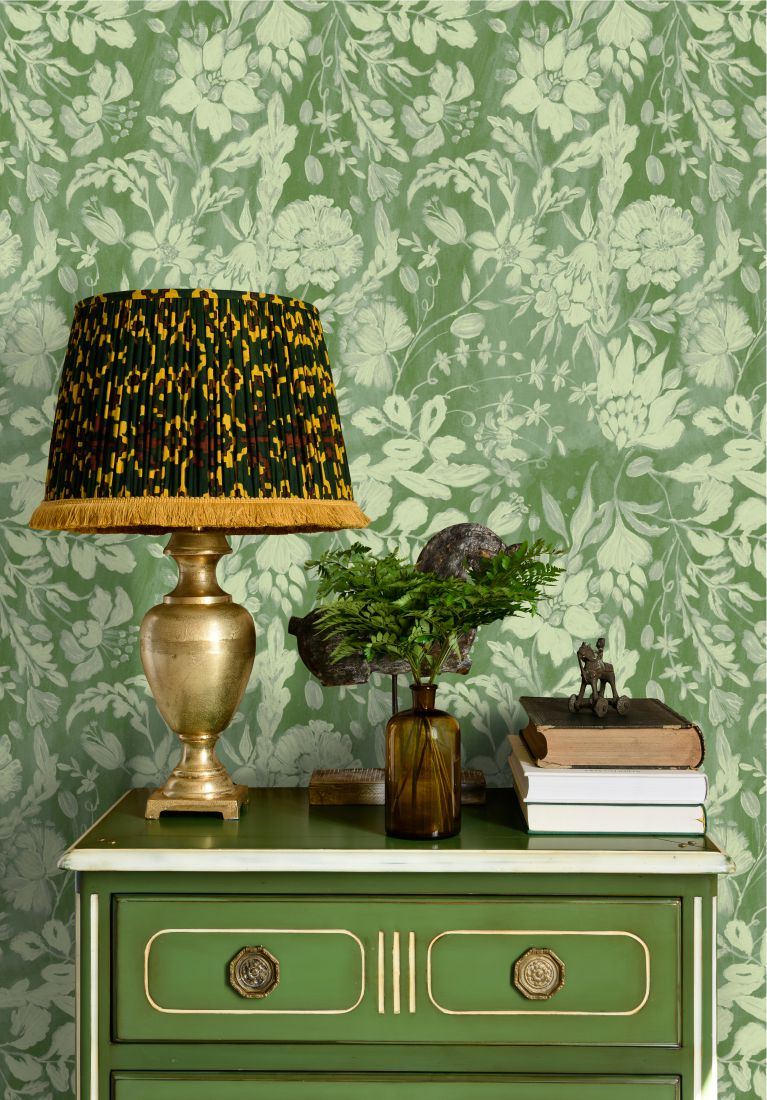 Die Tapete ist in knospengrünen, taupefarbenen und perlmuttfarbenen Farbtönen erhältlich und wird in einer einzigen 10-m-Rolle geliefert, um die Verwendung an verschiedenen Orten zu erleichtern.