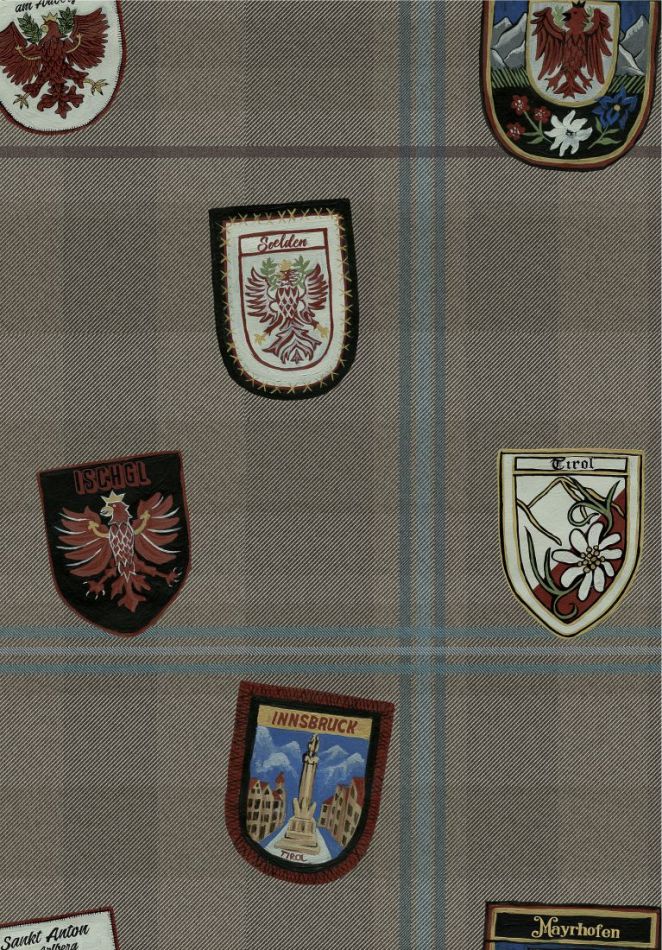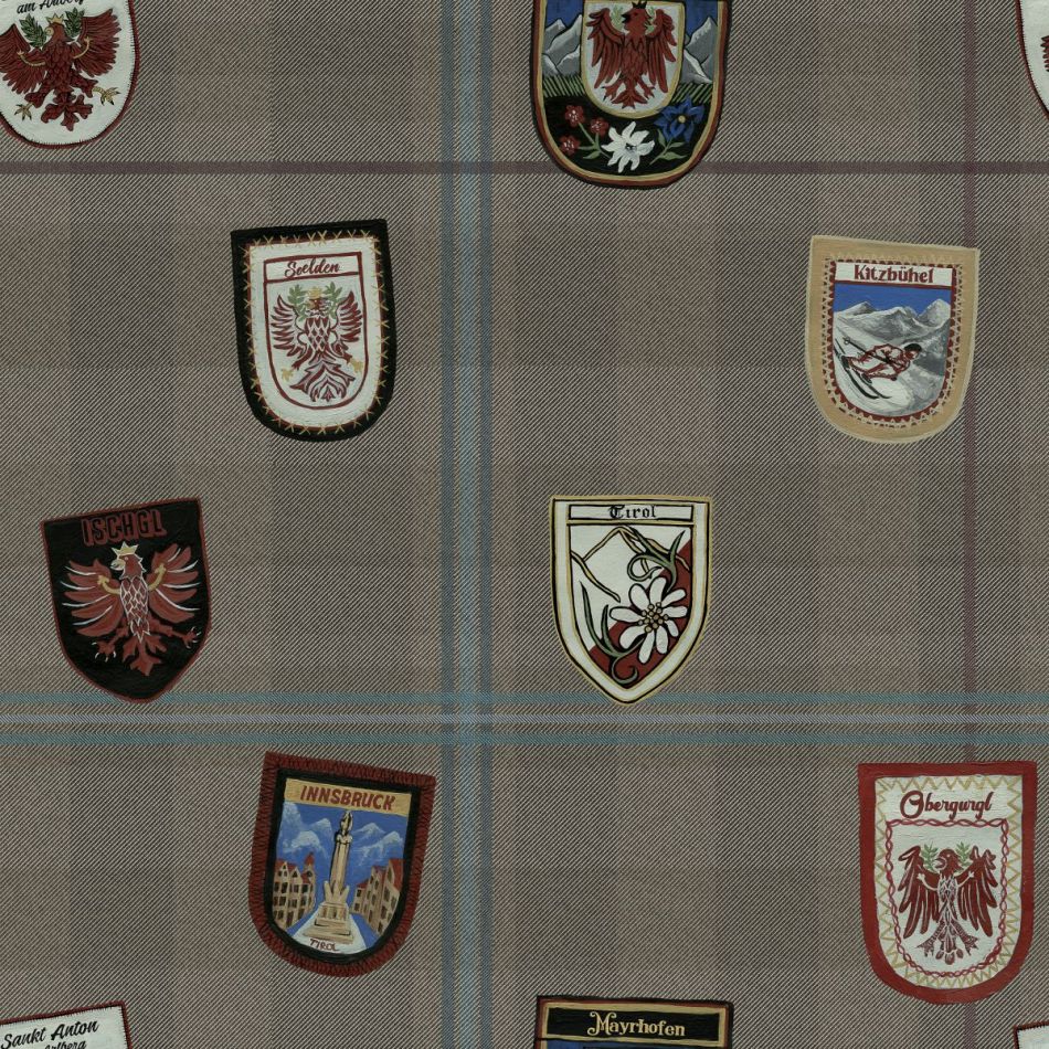 Die Tapete ALPBACH, benannt nach dem österreichischen Wintersportort, zeigt eine Sammlung von Wappen im Vintage-Stil, die über einen eleganten, karierten Hintergrund gepunktet sind. Zu den klassischen Motiven zählen der Tiroler Rotadler aus dem Mittelalter sowie viele weitere Symbole, darunter hübsche Alpenblumen, schöne traditionelle Architektur und natürlich ein rasanter Abfahrtsläufer.