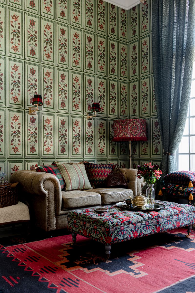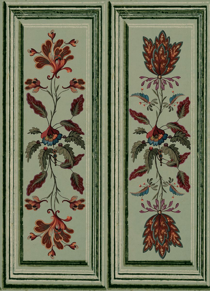 Mit seinen malerischen Strichen und folkloristisch inspirierten Elementen soll dieses Trompe-l’oeil-Papier den Look traditioneller Tiroler Tafeln erzeugen, die auf Möbeln oder sogar an Hauswänden zu finden sind. Die feurigen, stilisierten Blüten und zarten Blätter sind in Taupe, Alpengrün und dramatischem Schwarz erhältlich und werden von einer überzeugenden, bahnförmigen Bordüre eingerahmt, wodurch eine wunderschöne, skurrile Tapete entsteht.