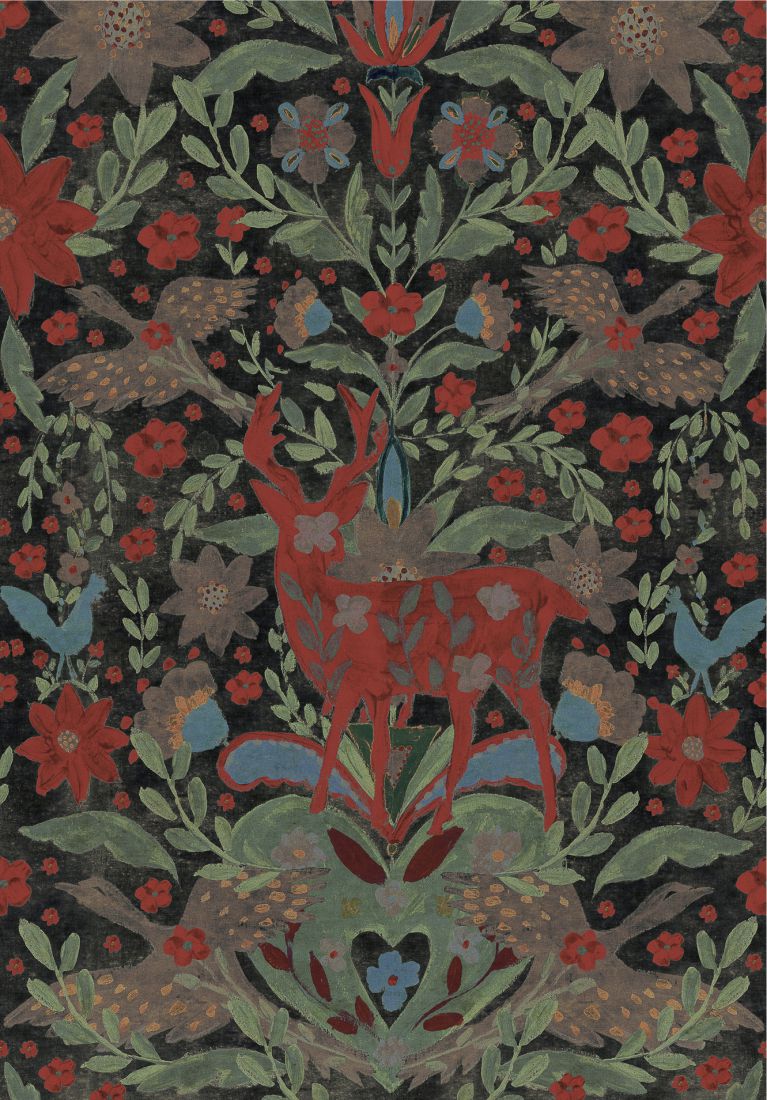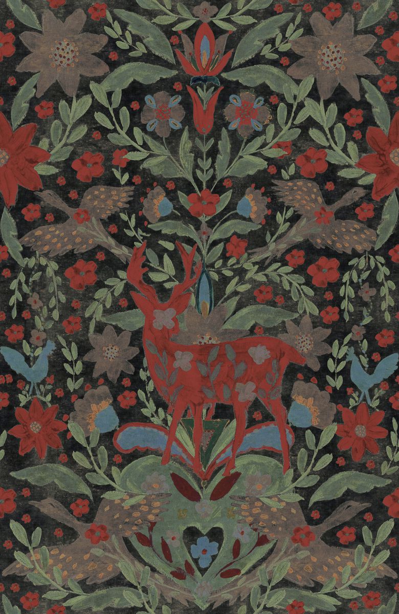 DER KÖNIG ist ein wunderschönes handgemaltes Design, das von der königlichsten Bestie der Tiroler Berge dominiert wird. Während mystische Vögel abheben, versteckt sich eine Herde lebendiger Hirsche inmitten eines Teppichs aus Blumen und Blättern im Folklore-Stil, die sich vor einem Hintergrund abzeichnen, der so blass wie Schnee oder so schwarz wie der Mitternachtshimmel ist.
