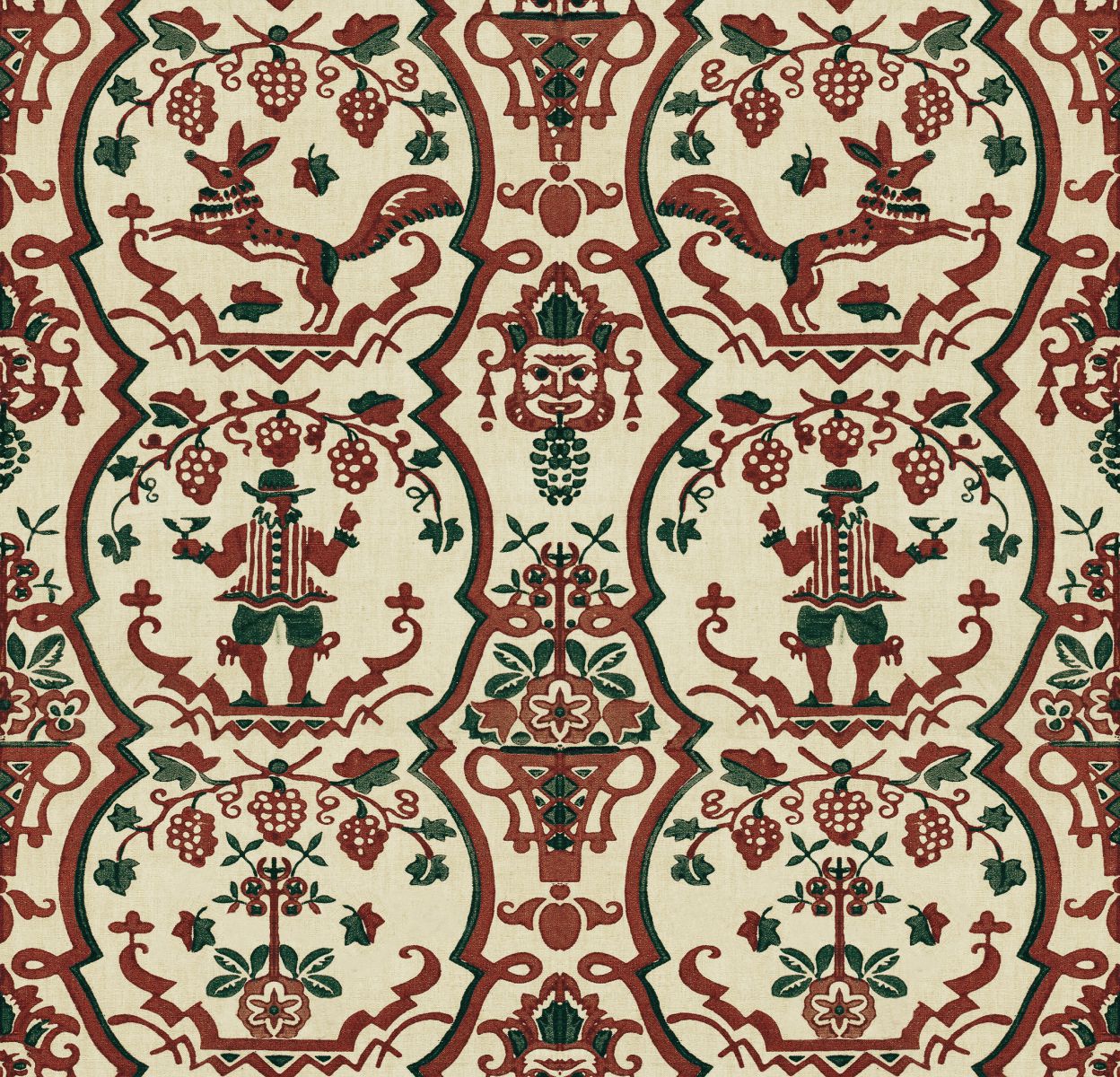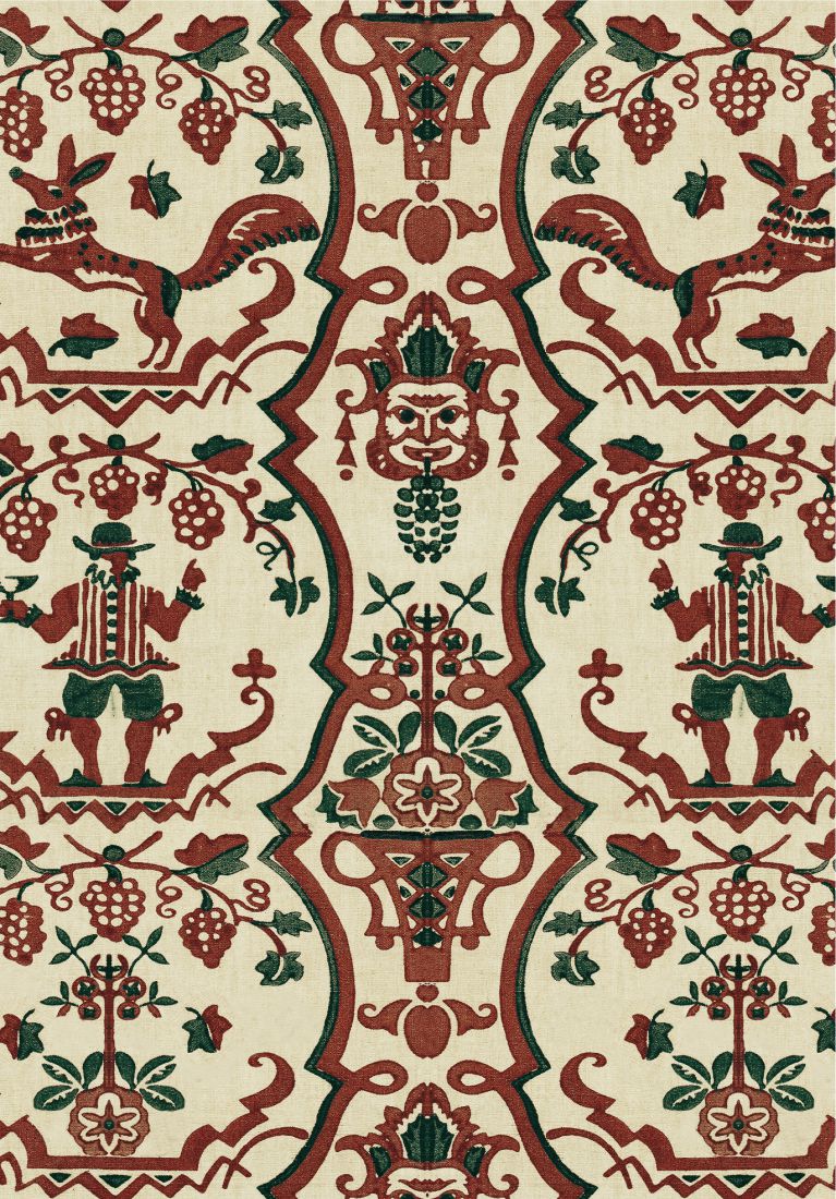 FLORICSOME ist einfach in der Farbpalette, aber kompliziert im Detail und legt ein zweifarbiges Folk-Design auf einen kontrastierenden Grund. Schauen Sie sich dieses druckähnliche Papier genau an und entdecken Sie verspielte Füchse mit Bürstenschwänzen sowie traditionelle Masken, mit Früchten beladene Weinreben und eine Tirolerfigur in Lederhosenhose und Hut, die sein festliches Glas füllt.