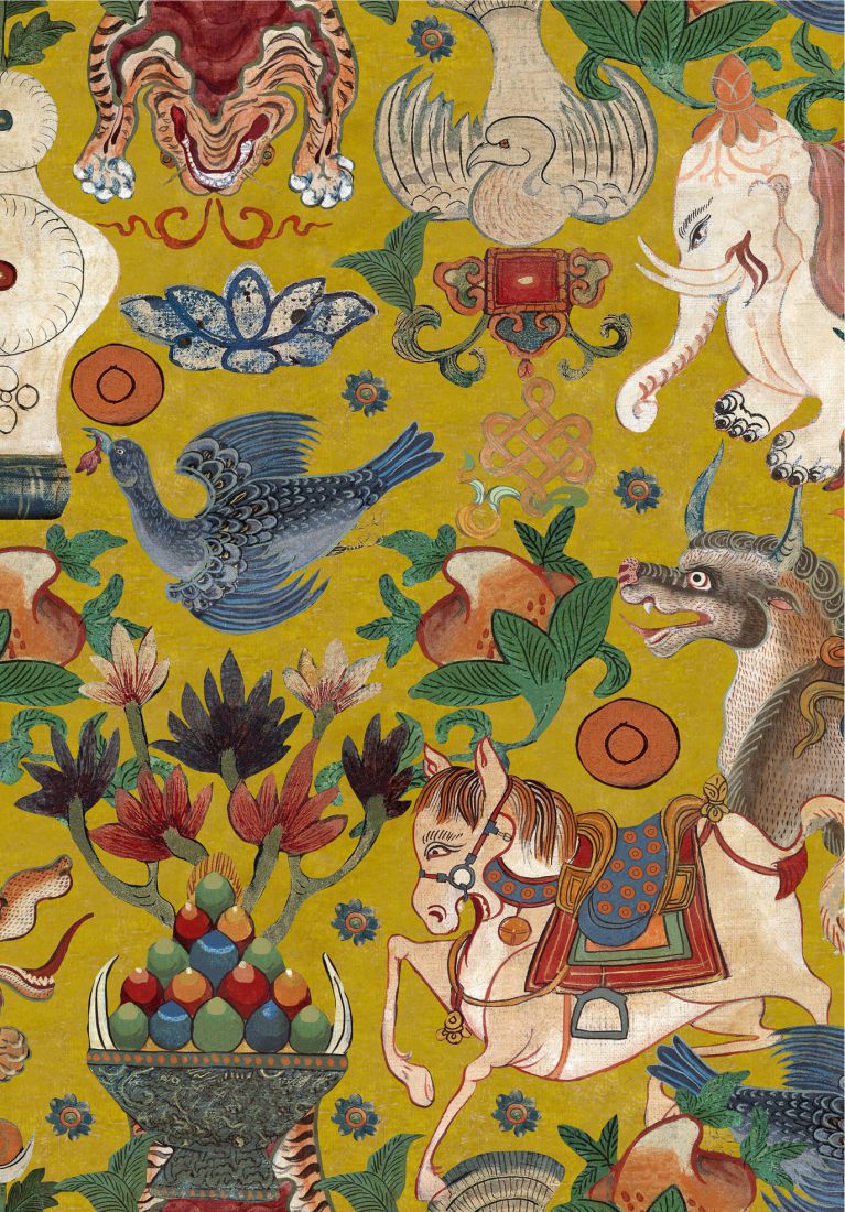 Erwarte das Unerwartete in der mystischen Welt von INCANTATION. Wo Kreaturen frei durch eine verzauberte Umgebung streifen, bleiben Sie wachsam, denn Sie wissen nie, was um die Ecke liegt. Exotische Vögel, geschmückte Pferde und mythische drachenähnliche Tiere werden Sie umgeben, während Sie durch Gärten voller beeindruckender Pflanzen und komplizierter architektonischer Figuren wandern. Mit cremefarbenen, dunkelblauen und gelben Hintergründen öffnet dieser lebhafte Druck Ihre Sinne, wenn Sie sich einen reichen, aromatischen Duft vorstellen, der in diesem faszinierenden und fesselnden Bereich durch die Luft strömt.