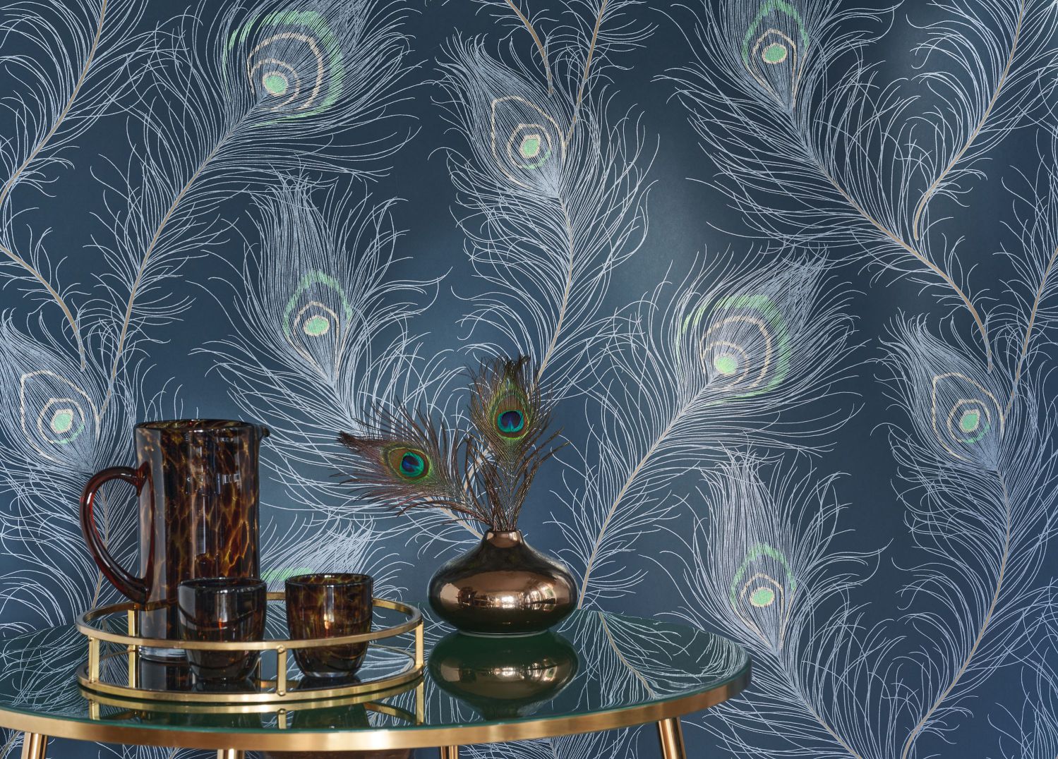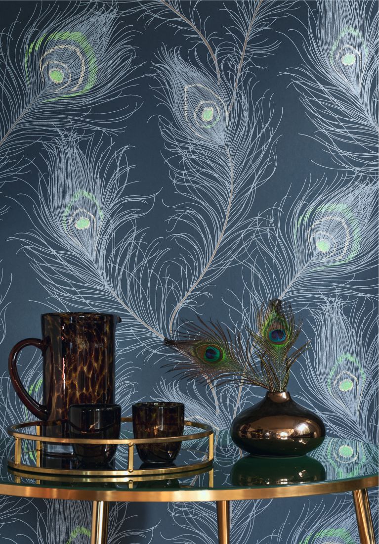 Boas, Fächer und federgeschmückte Kopfbedeckungen – stellen Sie sich Cabaret-Tänzerinnen vor, die sich kunstvoll hinter ihren Pfauen- und Straußenfederfächern verbergen… Revue lässt diese ikonischen Szenen der Pariser Cabarets mit ihrem frechen Charme wieder aufleben. Die überlappenden Federn bilden ein schimmerndes Muster auf einem eleganten, matten Hintergrund.