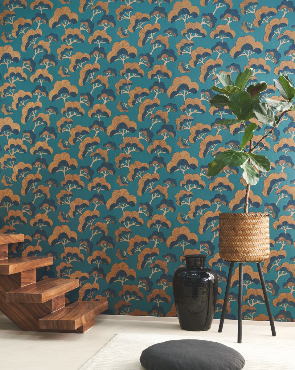 Unendlich elegant steht die japanische Weißkiefer auf den Hügeln der Inseln der aufgehenden Sonne. CASADECO hat hier zwei Techniken angewendet, um diesen symbolträchtigen Baum hervorzuheben: Puff für das Laub, schillernde Akzente für das Gerüst der Zweige und des Stammes. Die Farben basieren auf der zeitgenössischen Farbkarte: ein raffinierter Gravurgeist, sehr blasse Japandi-Atmosphären und elegante erdige und kalte Töne.