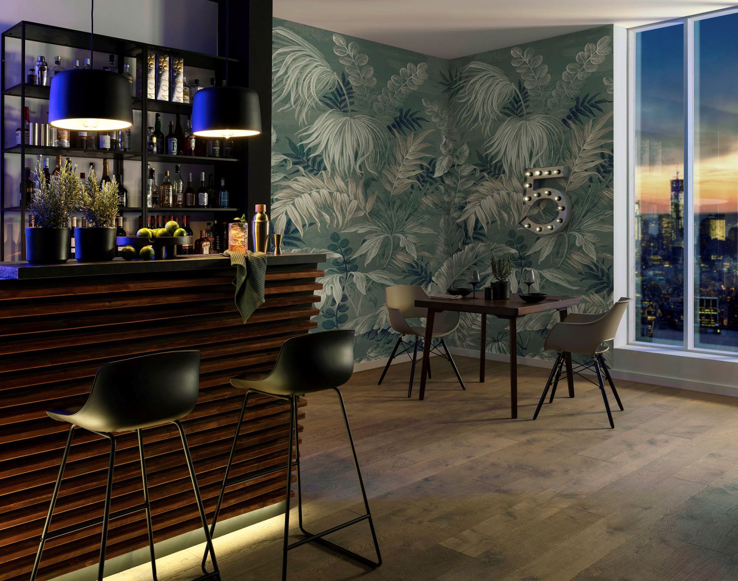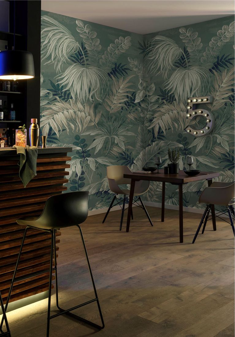 Üppiges Grün rankt die Wände empor und schenkt den Räumen ganzjährig ein frisches Ambiente. Das raumklimafreundliche Material der Wandbekleidung ist diffusionsoffen und frei von Weichmachern.