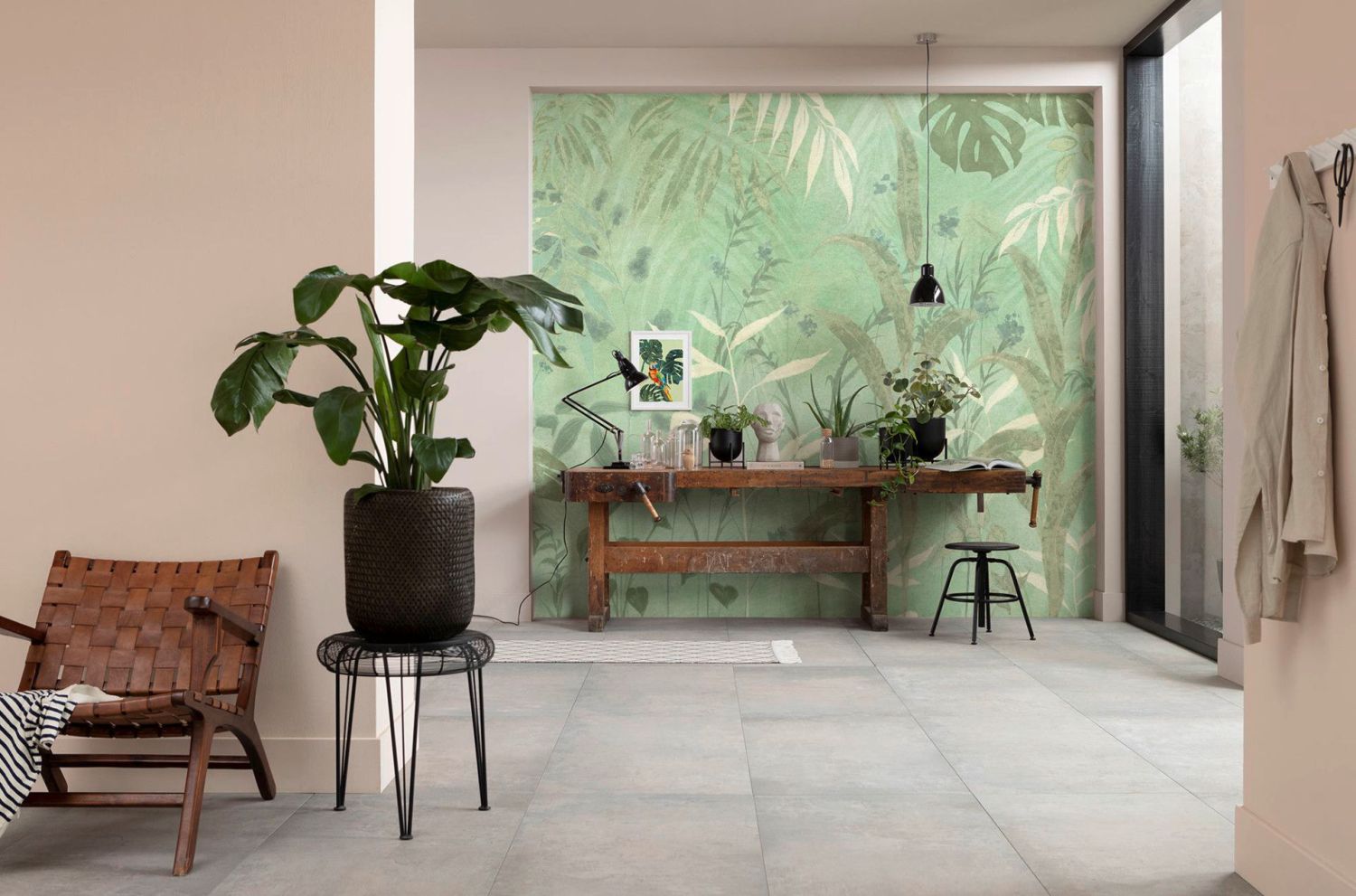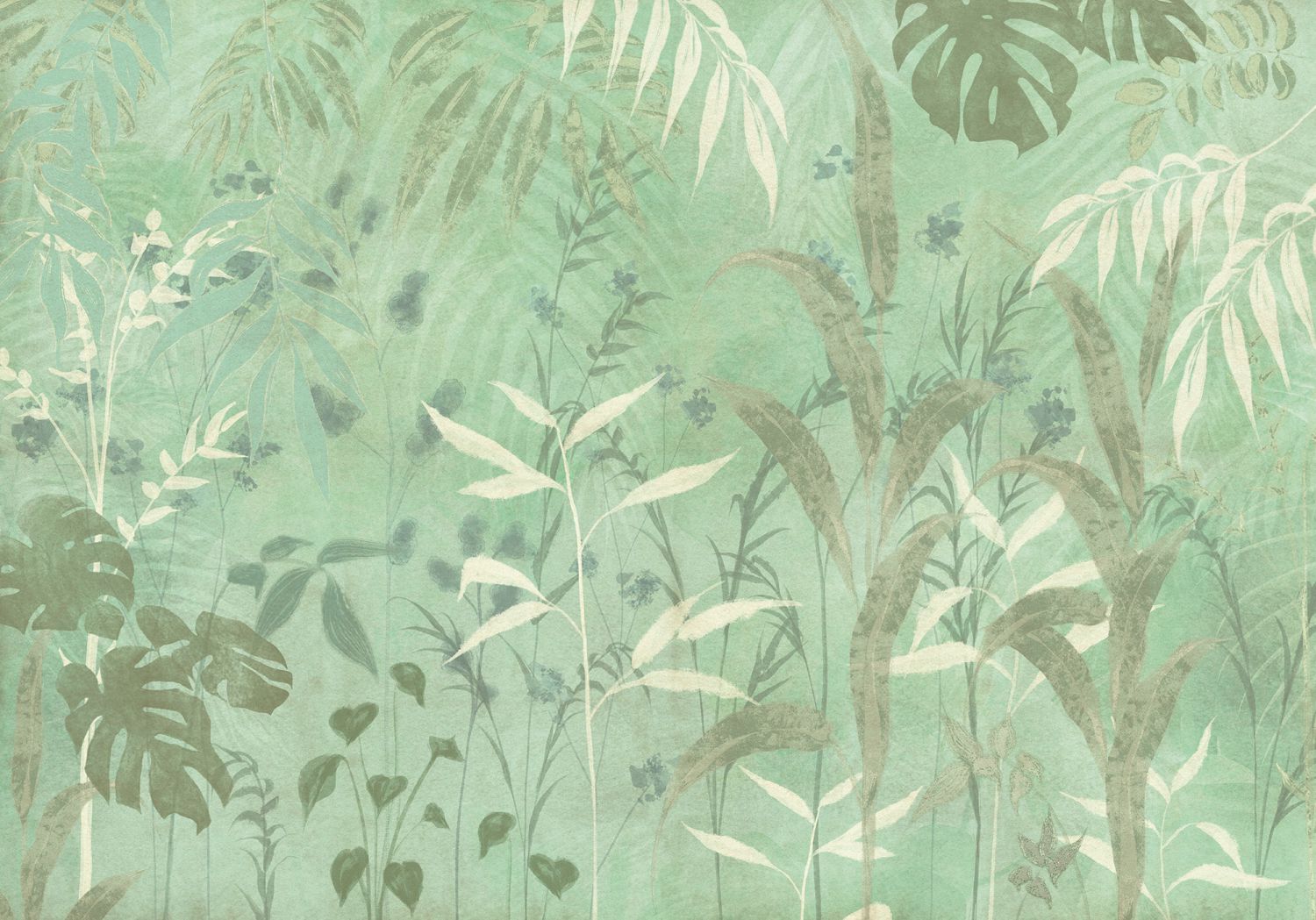 Sanft schmiegen sich die hauchzarten Gräser und Blätter an die Wände. Ihre filigrane Struktur und die pastellgrünen Farben verbreiten eine beruhigende Atmosphäre im Raum und laden ein auf einen Moment des Innehaltens. Die Designtapete besteht aus nachhaltigem und zertifiziertem, vollkommen ohne PVC.