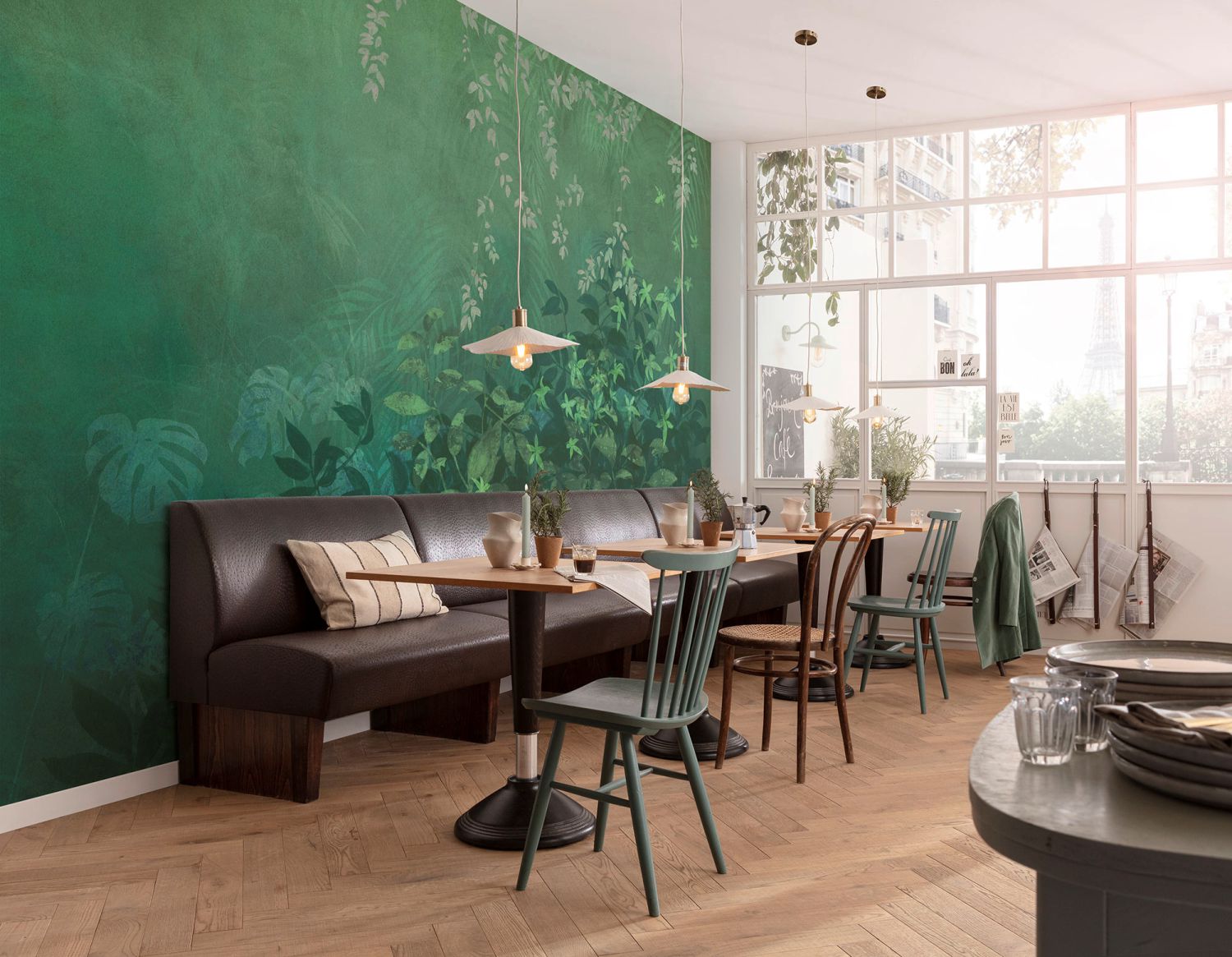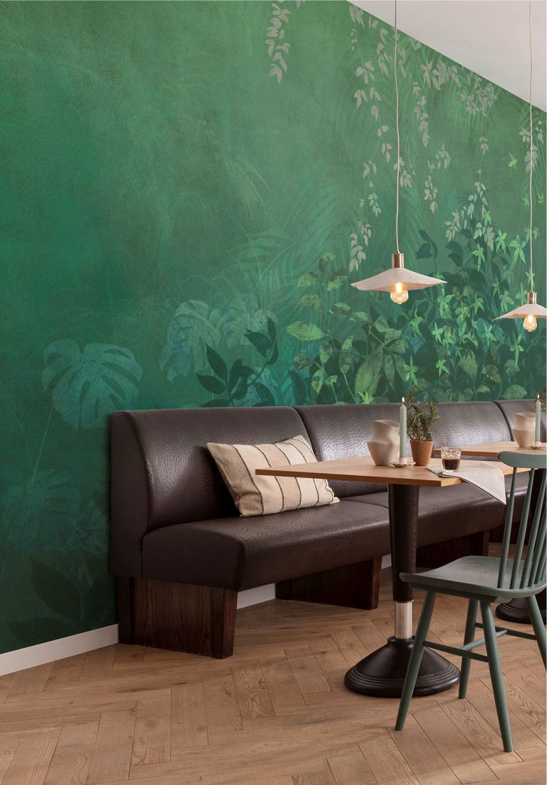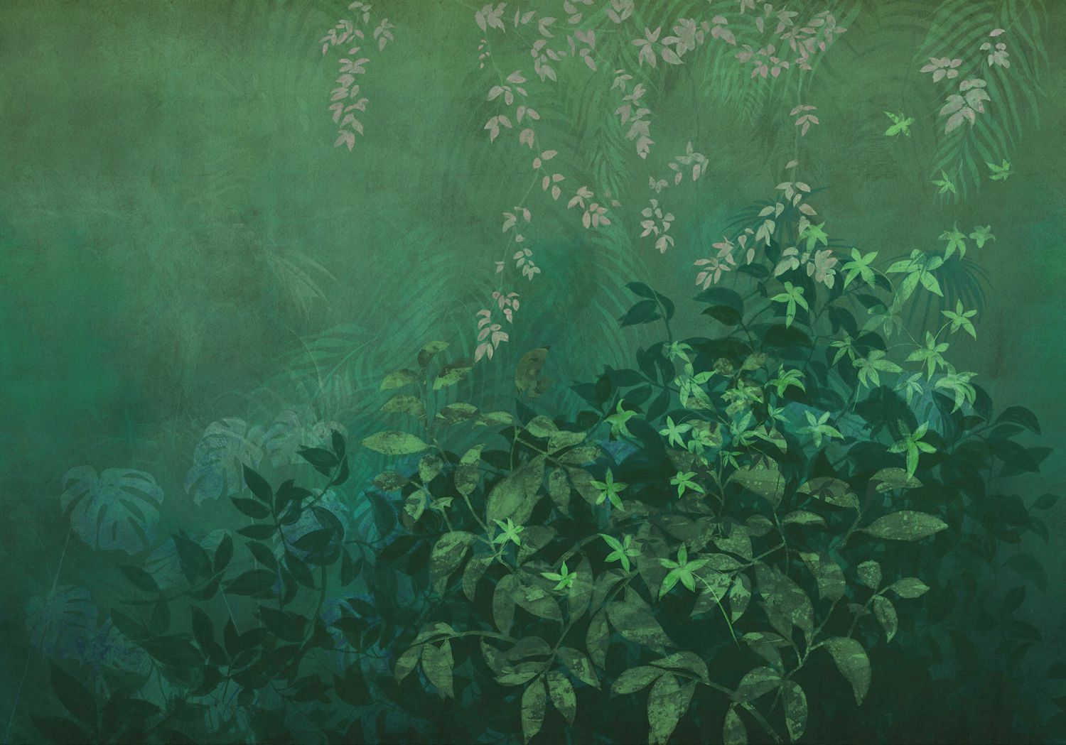 Satte Grüntöne ziehen sich durch das Bild und erzeugen einen starken Kontrast im Raum. Der weiche Farbverlauf schafft optische Tiefe und lässt das Motiv besonders hochwertig aussehen. Trotz dem Verzicht auf Weichmacher, ist das Produkt weich und anschmiegsam zur Wand.