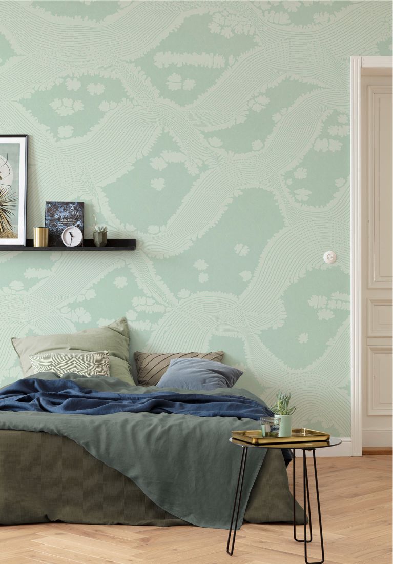 Das mintgrüne Design fügt sich stilvoll in die Umgebung ein. Die Strukturoptik der Oberfläche vergrößert Räume visuell. Durch den Verzicht von PVC und anderen Weichmachern ist die Designtapete frei von bedenklichen Substanzen und ideal für ein nachhaltiges und raumklimafreundliches Ambiente.