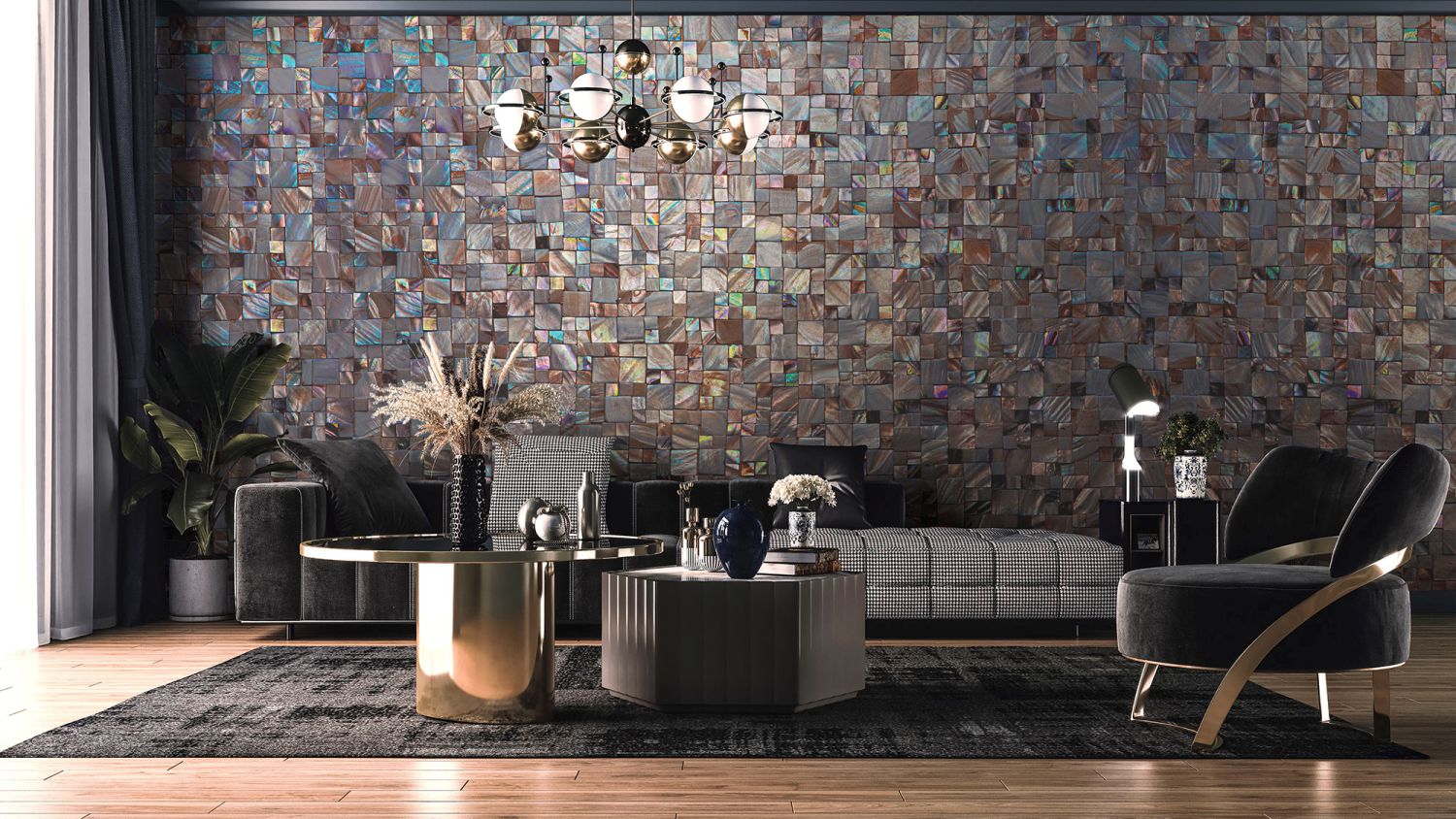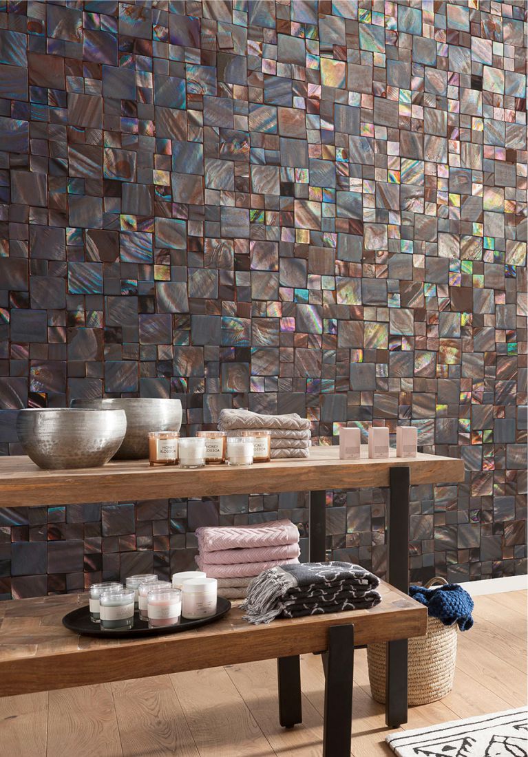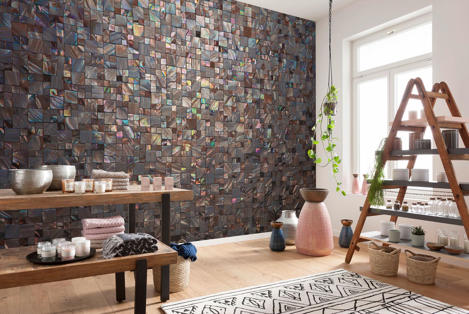 Zwischen schimmernden Kupfertönen leuchten bunte Quadrate hervor und vereinen sich zu einer Tapete in Mosaik Optik. Für eine stilvolle und nachhaltige Inneneinrichtung ist dieses Motiv genau das Richtige.