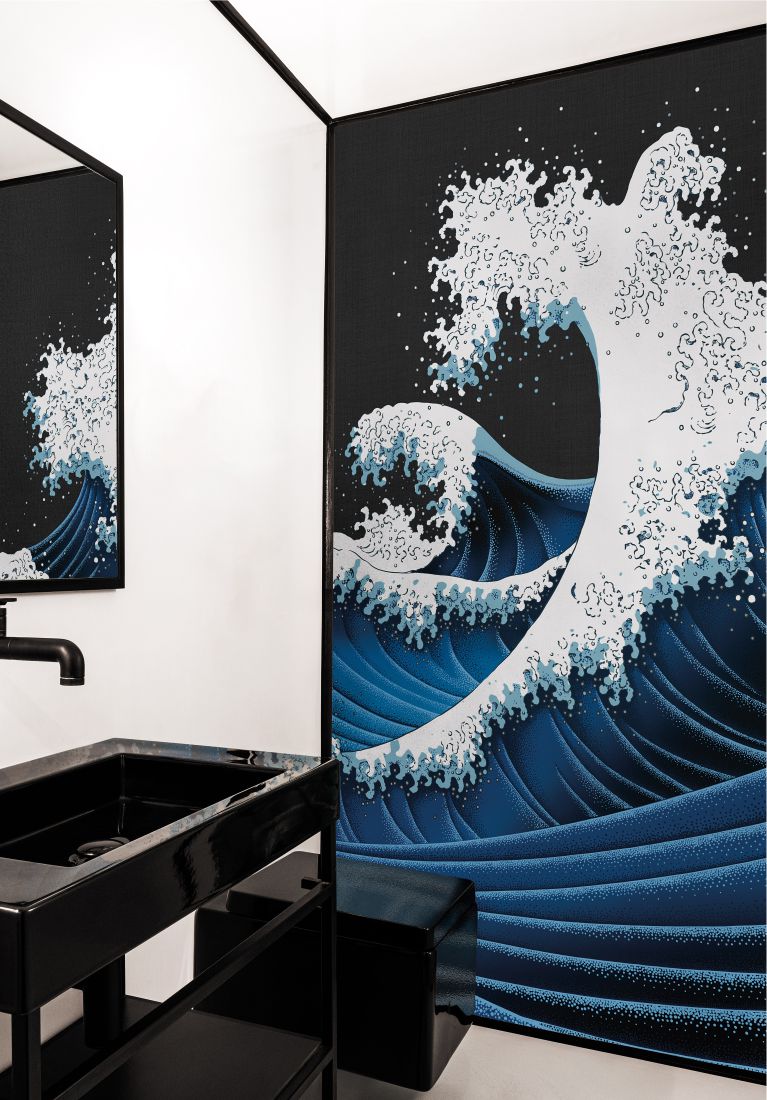 Wellen und Strömungen kreuzen sich in einer energetischen Komposition. Die Tiefe der Szenerie wird durch den Größenkontrast und die Farbgebung betont, welche die verschiedenen Ebenen in der Tiefe hervorhebt. Zwischen den Blautönen des Wassers – vorwiegend Preußischblau, das ab 1820 aus den Niederlanden nach Japan importiert wurde – und dem Weiß der Gischt entsteht ein lebendiges Spiel.